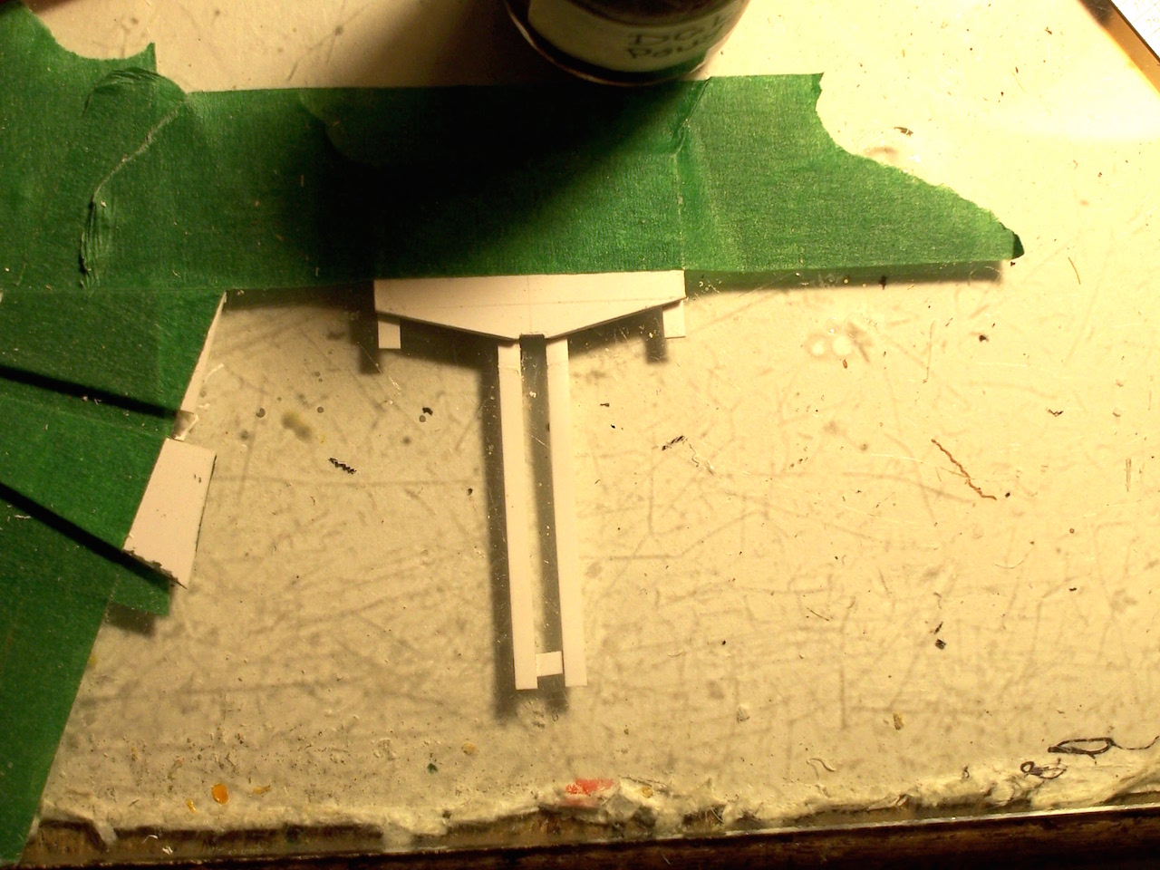 Initially, I had cemented some cut-to-fit pieces of styrene into the base of the H-columns, with the intention of creating a larger gluing surface to attach the columns to the platform. It then occurred to me that the butterfly roof would require drainage at its centre, and I decide that each column would be fitted with a base-plate of .010" sheet styrene, each plate also with a hole to accommodate the downspouts (1/16" styrene rod), and with corresponding holes drilled into the platform. All of this should afford a somewhat sturdier attachment of the various components.