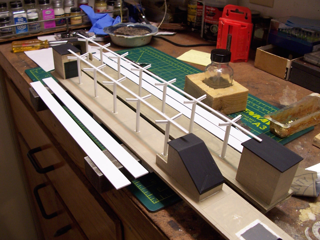 There's some more brush-painting to be done on the columns and downspouts before the roof material can be added, and I think that I may also cement the elevator buildings and stairwells to the platforms as the roof will extend partially over all of them.