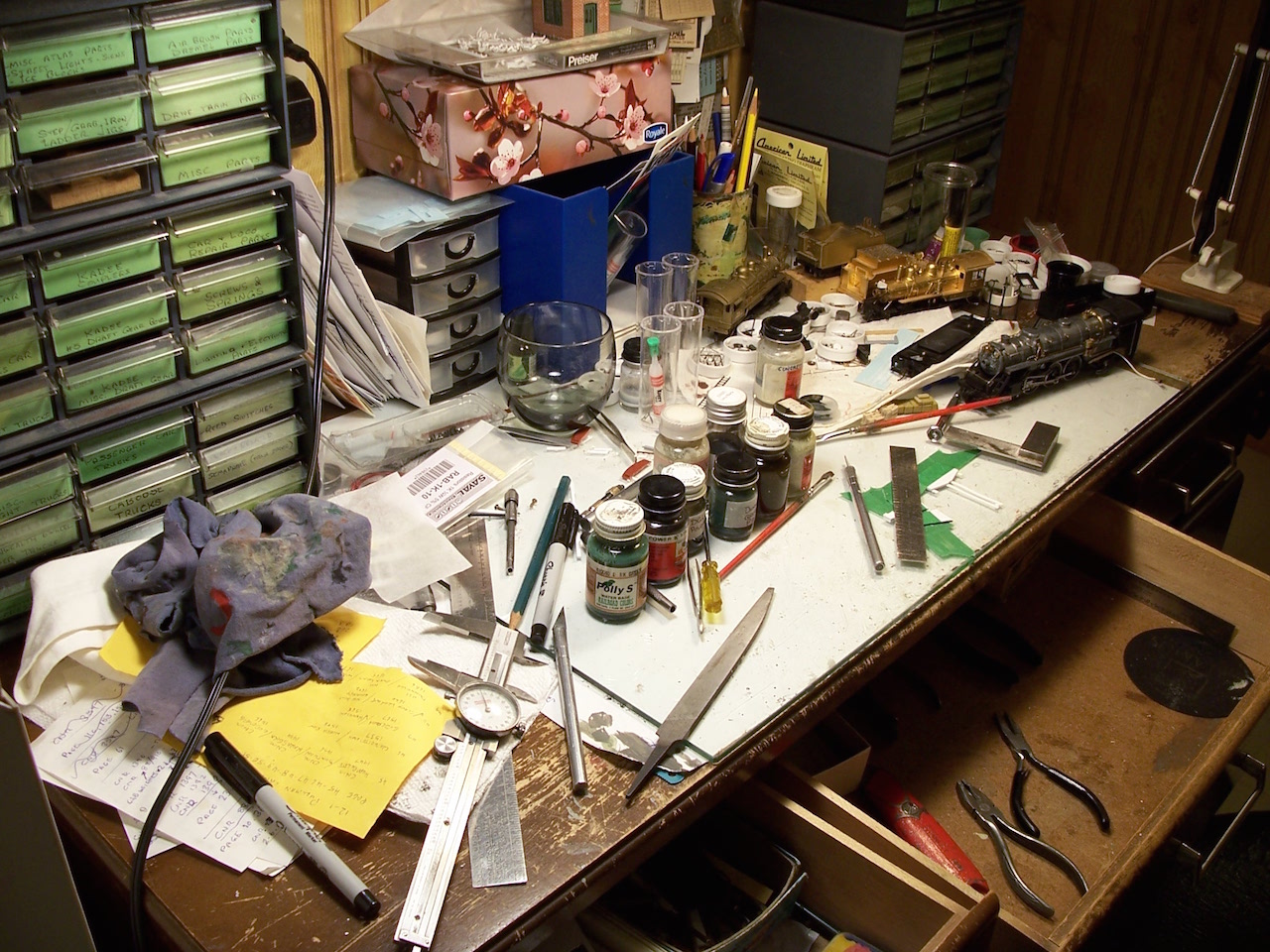 The only reason the area looks somewhat tidy is that the photo was taken in what was, at one time, the paint shop (which is now in a separate room in the garage, which is about a 100' behind the house - and not used as a garage). I use this room mostly for soldering or working on largish structures, and for storing the paint and airbrush stuff.