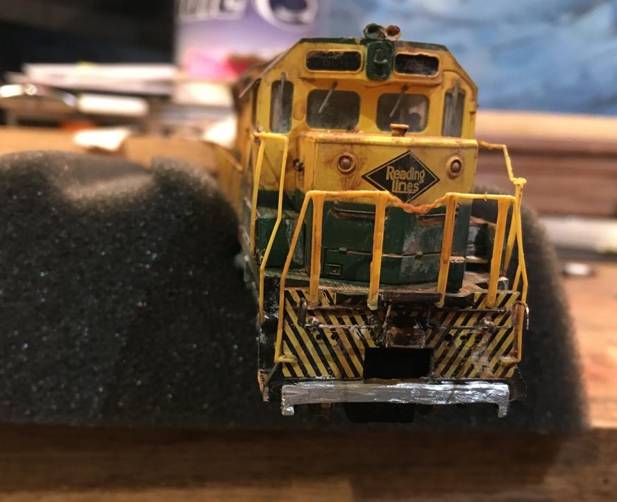 I've been weathering my pair of SD45s in the last couple of weeks.  I included a picture of the finished Erie Lackawanna unit in "Weekly Photo Fun" for the past week.  Before I tore into the Reading Unit, I wanted to refine some basic "fade" techniques.  The Reading unit's yellow and green paint is much too bright to reflect the dilapidated look I want to create.  The EL unit got a good blast of gray from my airbrush, and I wasn't left with a result I really liked.  Ran into a good tip from YouTube (Boomer Diorama) who sang the praises of brushing on Tamiya X21 flat base with a little isopropyl alchohol added. You brush it on, let it dry to a crusty white and rub it off to get instant fade. The base coat then makes it really easy for washes to "stick". I am really stoked to try this technique on the Reading Unit. Just bought some X21 and it should be in my mailbox this week.