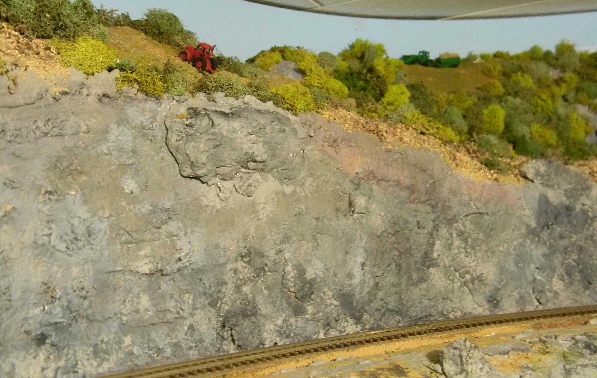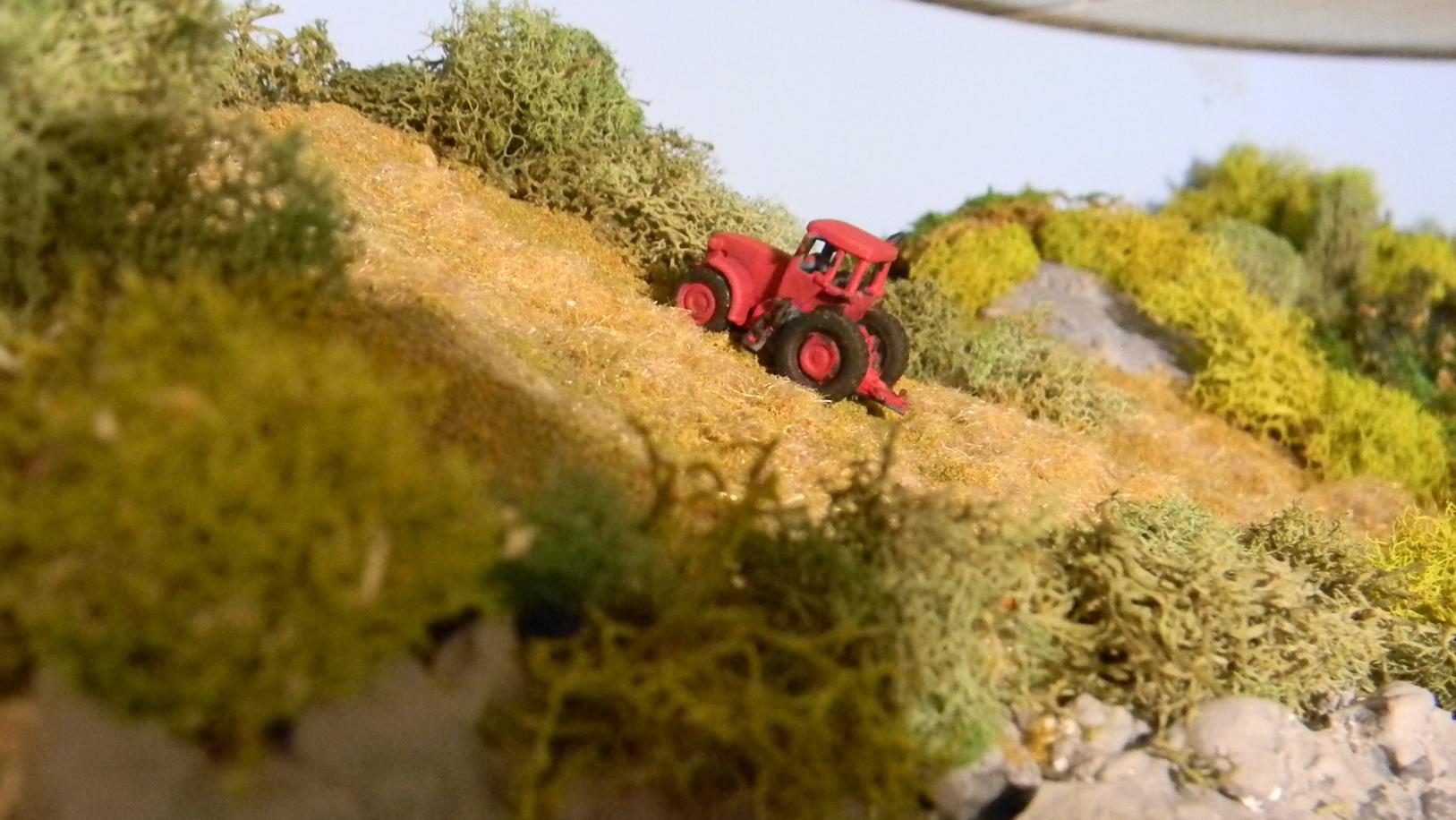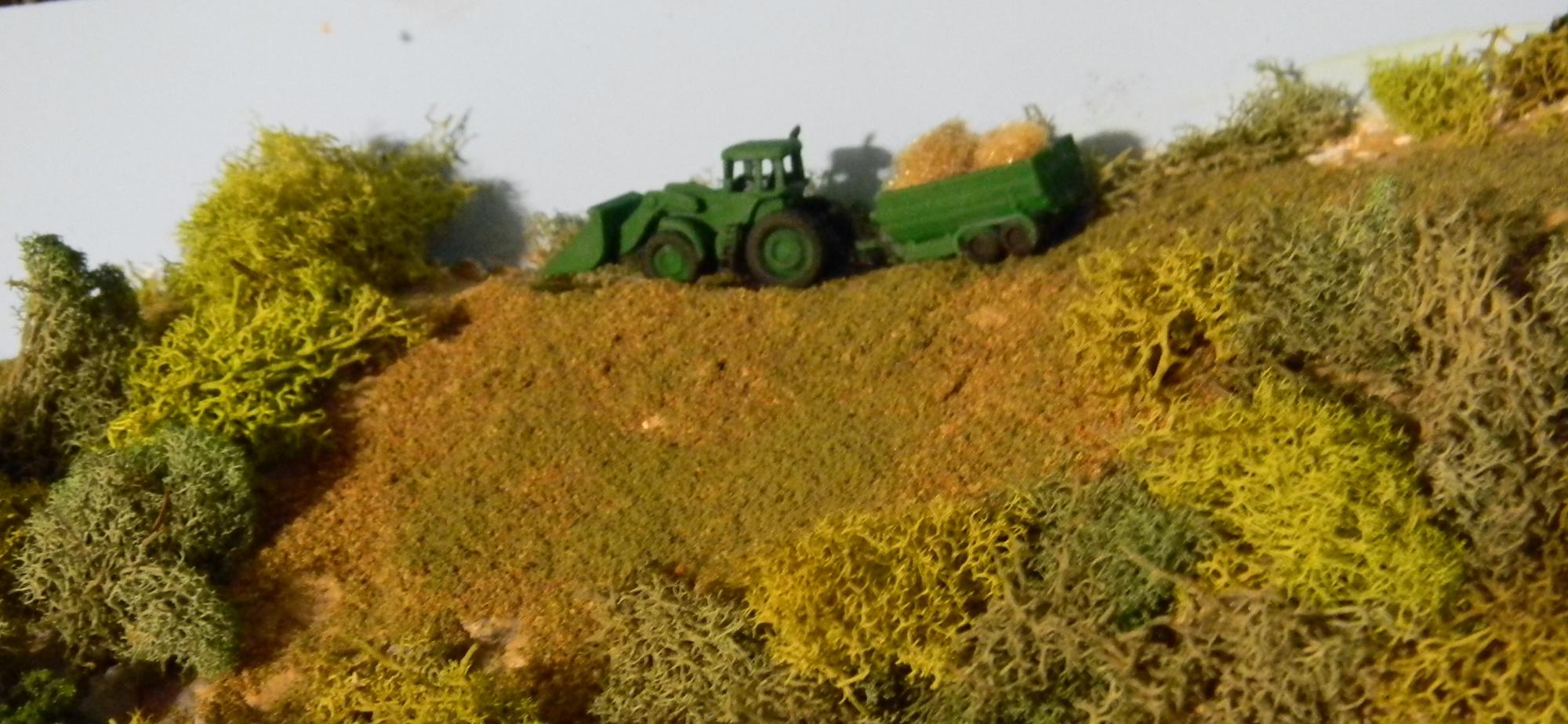 While working on the upper section of Mud Run a few weeks ago, I decided to put some farm fields/pasture in the scenery.  I then thought what else might be a good addition to the scene.  Started looking for cheap N-scale tractors (N-scale to give the illusion that the fields are further away than you think when you look up at them.  Found a package of 2 different 3D printed tractors (one with trailer) from Outland Models (Chinese).  They also had some "haylike" filler in a baggy that came with the tractors and I thought it made pretty good freshly cut hay.  Spread some of that one one of the fields in rows and loaded up the trailer with the same. Decided to paint each one today and install them on the heights.