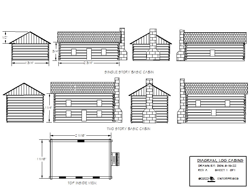 Anyway, my initial plan is to go basic until I get the hang of it, I want to see how difficult it is to do individual logs, just like the pioneers. Here's my initial sketch of a single and a two-story cabin. I can add porches and whatever as things move along. I do not intend to detail the inside but it's always an option
