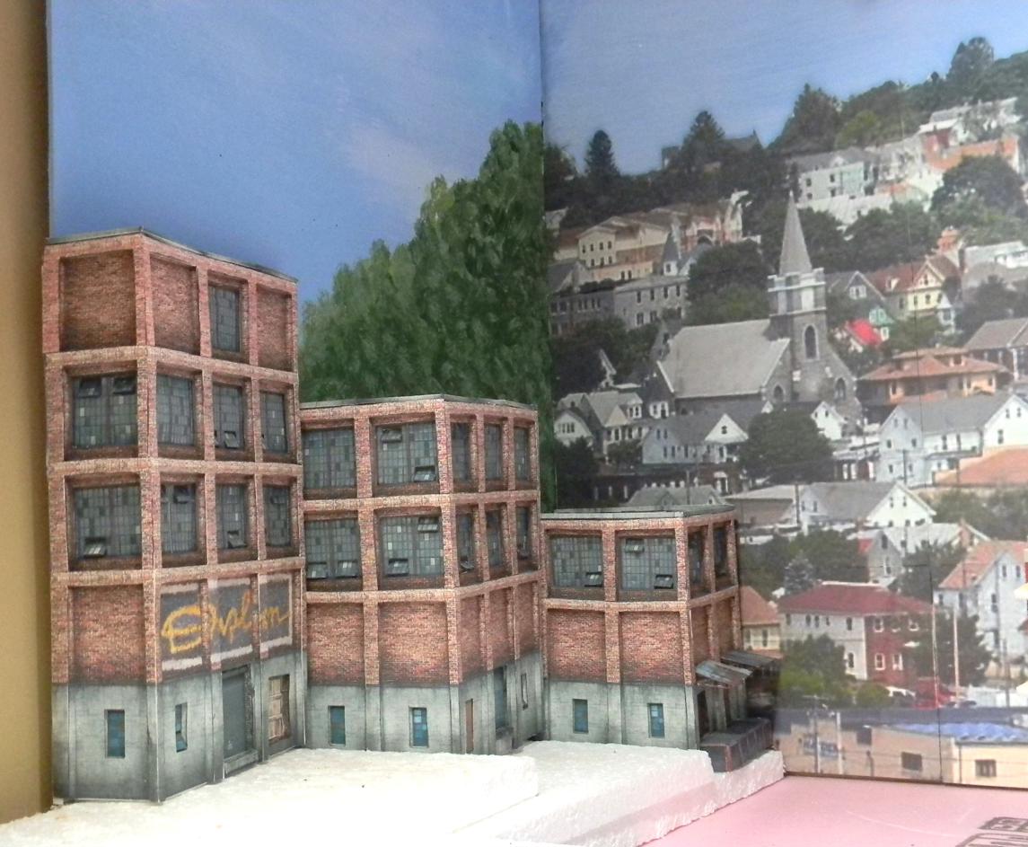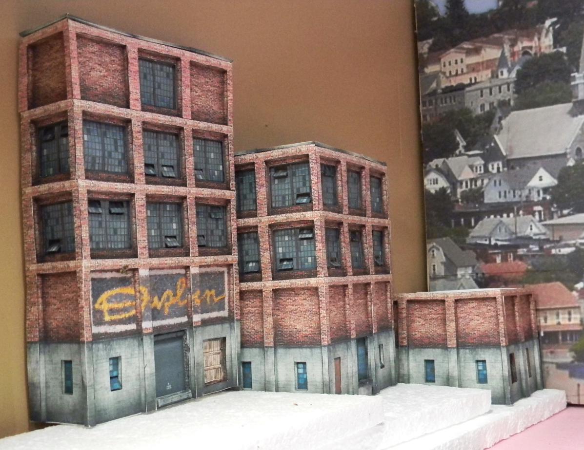 Did a little exploratory in my workshop and found a discarded piece of Homasote that was wide enough to serve as a backdrop, so I figured it was fate. Cut it to the right width and slid it behind the finished warehouse.