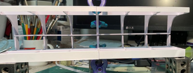 So despite trying to keep everything nice and square I managed to torque the viaduct side out of alignment. The PVC sheet is flexible enough that its not a big deal on the model it would be a huge deal on the real thing. Fortunately I can build this in my shop and keep everything nice and square throughout the build. The one thing I think I need to add is another cross member on the back near the top. That area seems to be way to flexible for my liking.