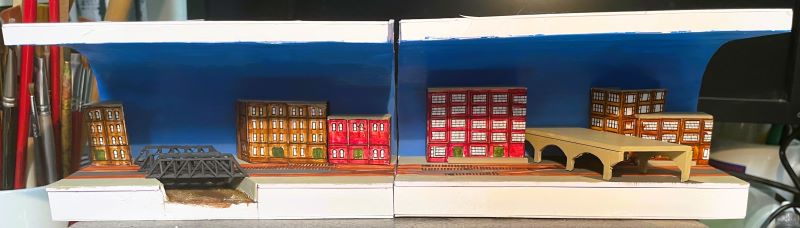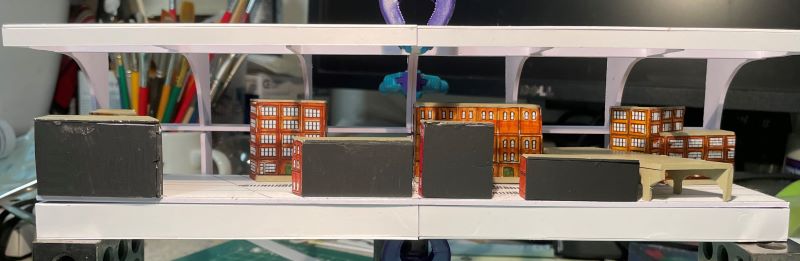 Here is the back row of buildings on the bridge module. I want to keep the buildings in the back relatively tall, mostly 3-5 stories. I think this is particularly important around the bridges to really use that vertical element and suggestion of a brick canyon.