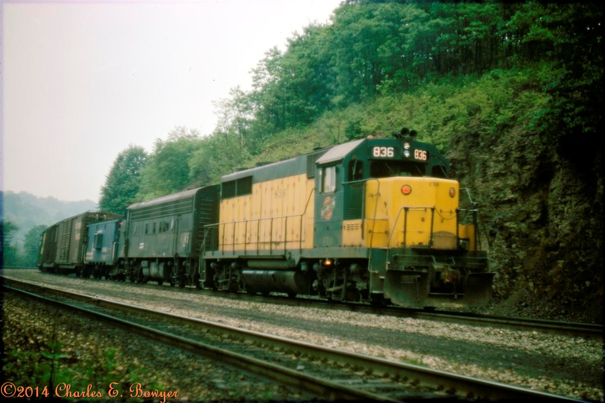 June, 1977 Leaning on the rear of a manifest train at McKinley Road. The head end should just about be at the summit of Highland Cut.