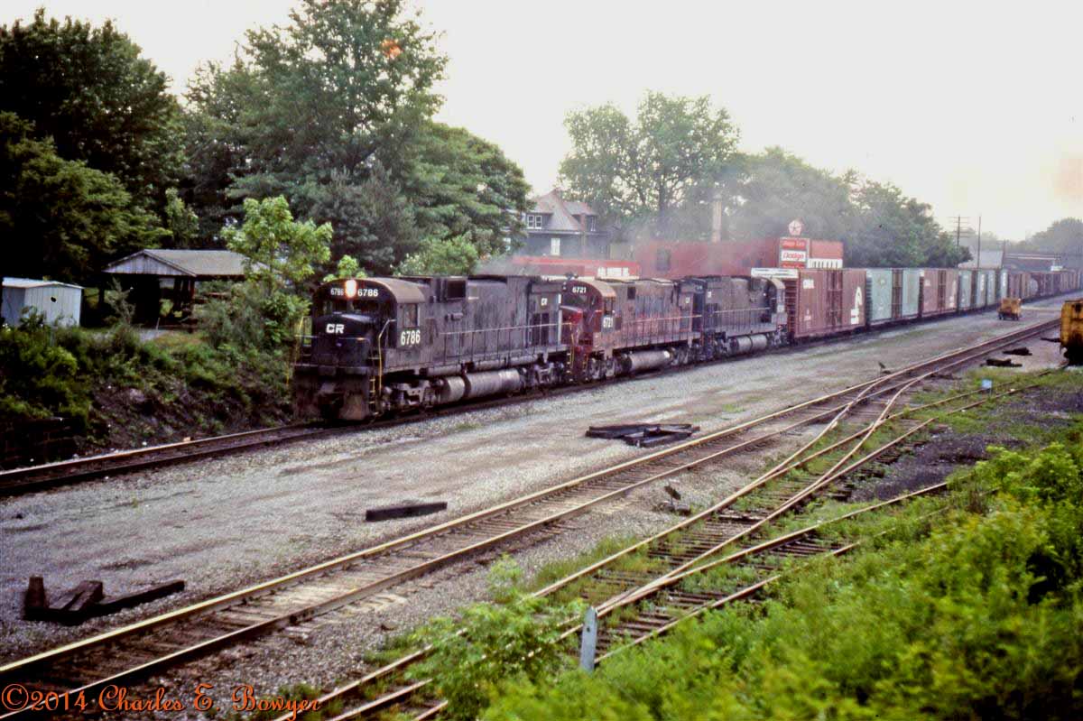 A trio of ALCo Centuries leads this westbound manifest at MP 50, Fort Wayne Line, East Palestine, Ohio June, 1977.