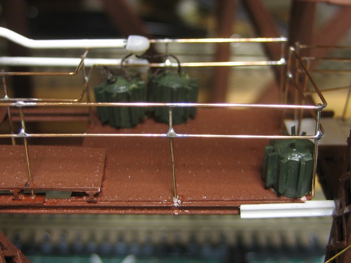 Before I called it a night I went one step further and finished up some of the electrical conduit. It's more of the same bent wire that was used elsewhere on the bridge, but, this time I needed to add a service head to the end of it. I just carved them of some old plastic sprue and glued some string coming out of it (to represent wire). These two pipes will be the Line & load for a small bank of transformers that will be mounted on the platform.