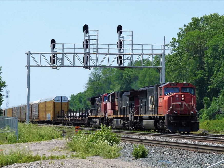 A Conrail truck train heading east under the signal bridge at the Ohio/Pennsylvania State Line. MP 49. July, 1978.     Charlie
