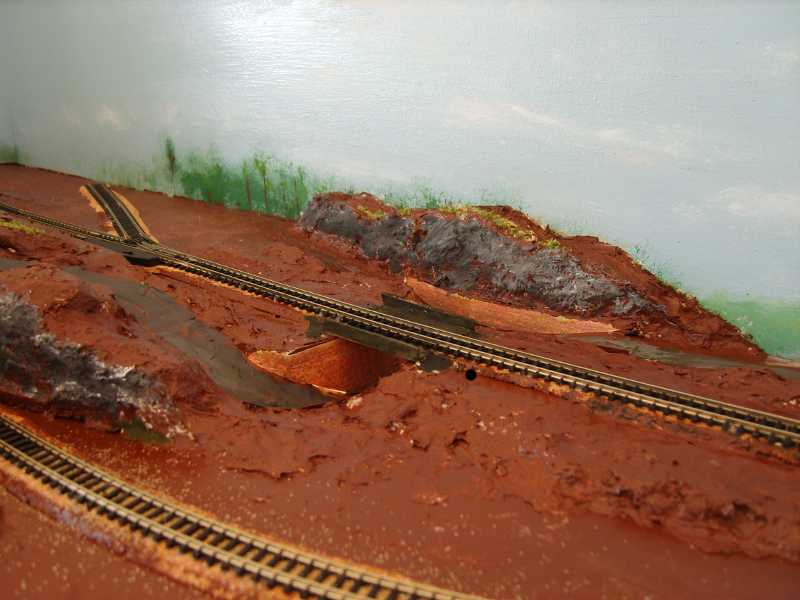 With the red stone prevalent in the area I'm now stuck with the question of how to paint the rock faces near the tunnel. I gave them a coat of grey, which doesn't look too good at this point, but it might have to be changed into something more sandstoney. Around here where I live most of the rocks are granite, so that is the inspiration I have nearby, but that would be exactly what I'm not after. The ballast is also middle brown, so that would be the palette I'll be using.