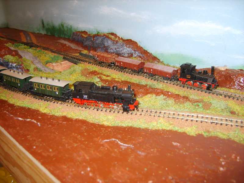 At last I got the rest of the track here and within a few days the track was laid and the wiring for the rest of the track was done, so now one engine can run back and forth on the layout. Earlier I painted the backdrop and the ground and added some ground forms using styrofoam and paper mache. If you look closely, you may find some North Sea sand between sleepers here and there. Unfortunately I am pretty much out of that, so the rest will be ballasted using WS products. (note to self: need to collect sand whenever the opportunity arises..) I'm not sure whether I'll weather the track now, it seems to look pretty nice the way it is right now.
