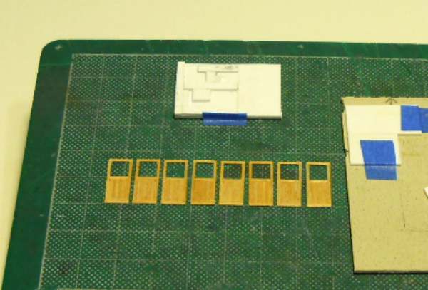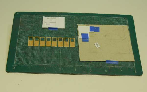 In this photo, are eight of the twenty-seven wood doors, that have to be built and installed. Each of the doors is built up with 12 separate pieces of 0.020" X 0.035" strip basswood. ( 0.012" X 0.040" would have been better, but the .020 X.035 was just a little "stronger", and, therefore, better for my old fingers to work with.)