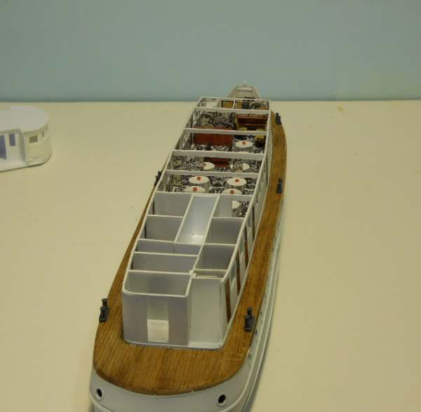 In the forward starboard corner, in one of the prototype photos, there is a bookcase, under the forward windows, and what appears to be a single seat ( inboard ) and a double seat ( Outboard ), bench / chair. Those details have been added, and the tables have red globe vases for centerpieces. Those will get some kind of flowers, greens, or whatever.