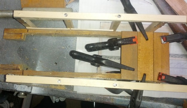 Looking downward. The first 3 1" wide floor boards are being glued.