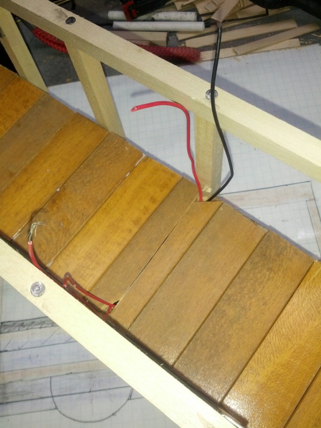 and finally - the wiring for the light (2 red) and the chug-chug sound (red & black) are threaded through the floorboards