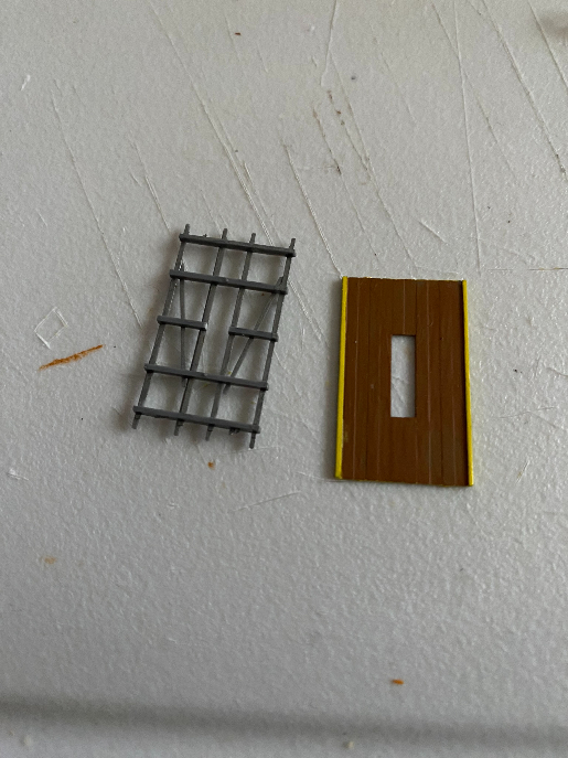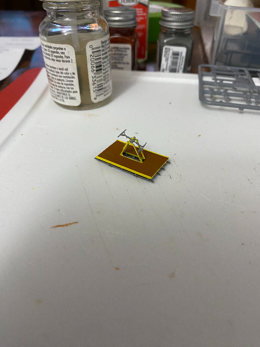 Well I started to paint the handcar and I must say it sure isn't easy. In the photo below you will see the platform painted brown and the sides are yellow. The frame is painted a steel color except for where I need to apply glue. It is hard to see in the image that the frame is painted but it is lol. I didn't realize that there would be so many little parts and I must say that tweezers have become a very good friend for this project.