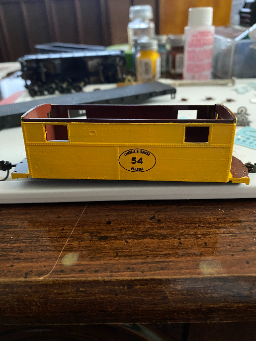 I will say this, this is sure a pain in the rear. The handle broke when I was cutting it out, then it was a task gluing it back together. Once I got that done, I then got it together and it has been sitting for about 2-1/2 hours because I don't want to touch it. Well below is the photo of whats done so far. I took a break and started to strip the decals off a B&O hopper to turn it into another C&I. No photo's yet of that one though.