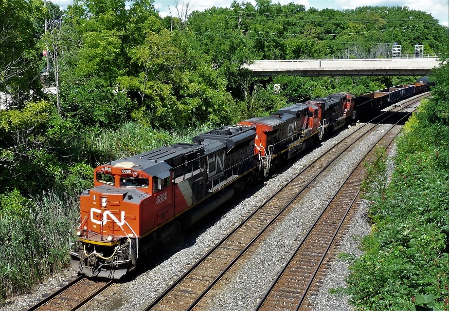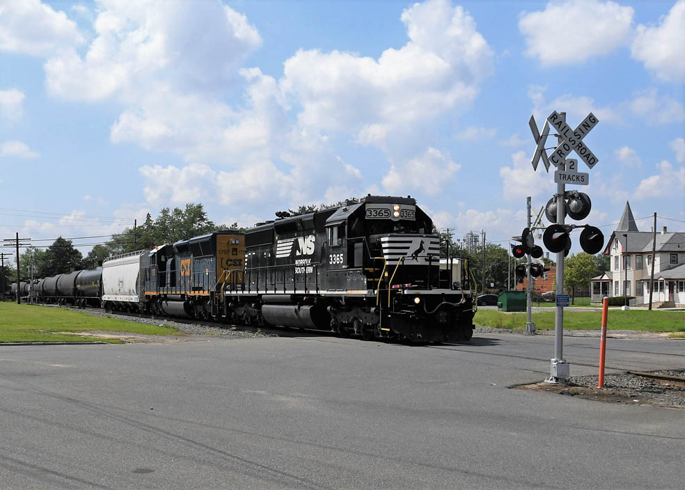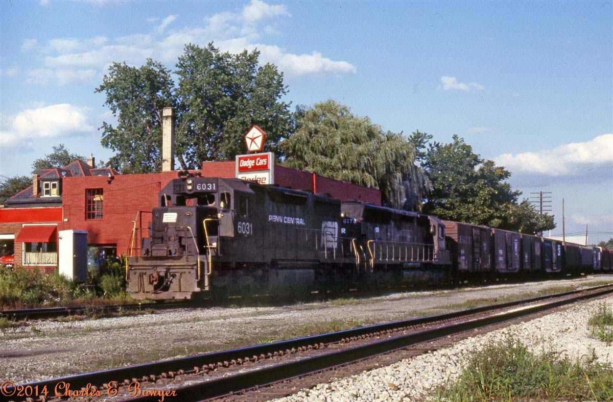 Westbound manifest past the Neil Motors Dodge dealership in East Palestine, Ohio.