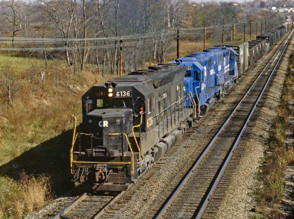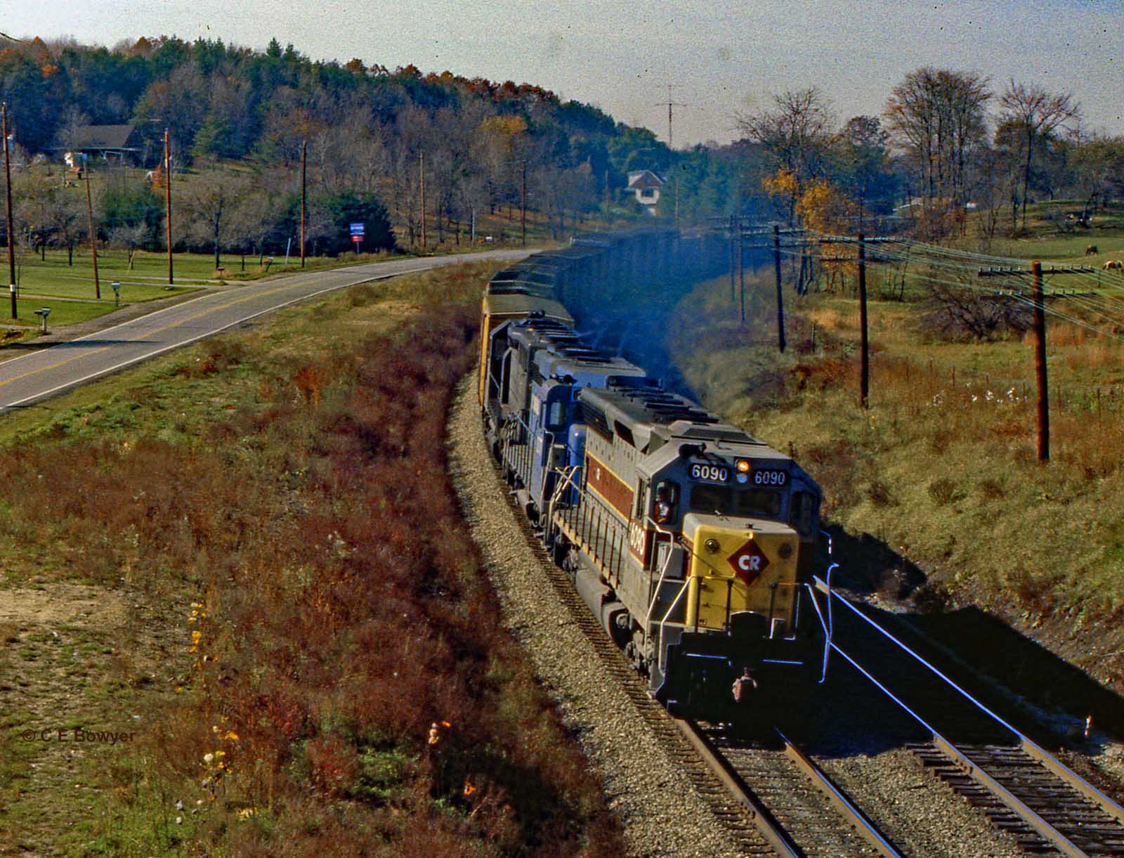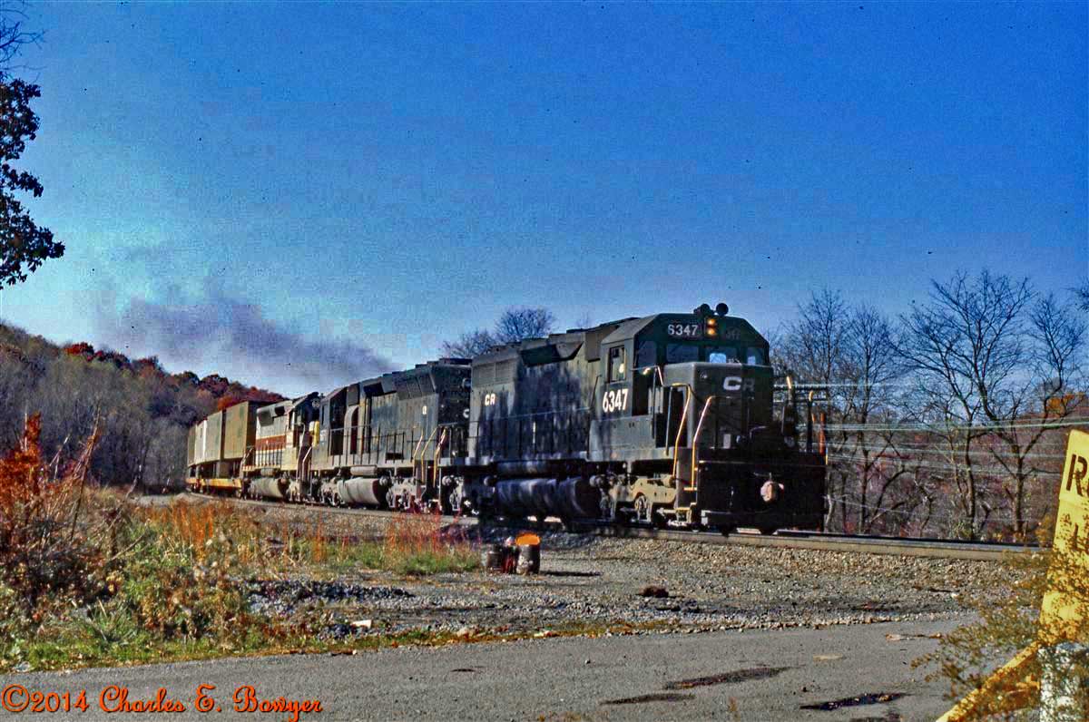 A Conrail mixed freight climbing out of East Palestine, Ohio in November, 1977, taken from the Neeld Road Bridge, just west of town.     Charlie