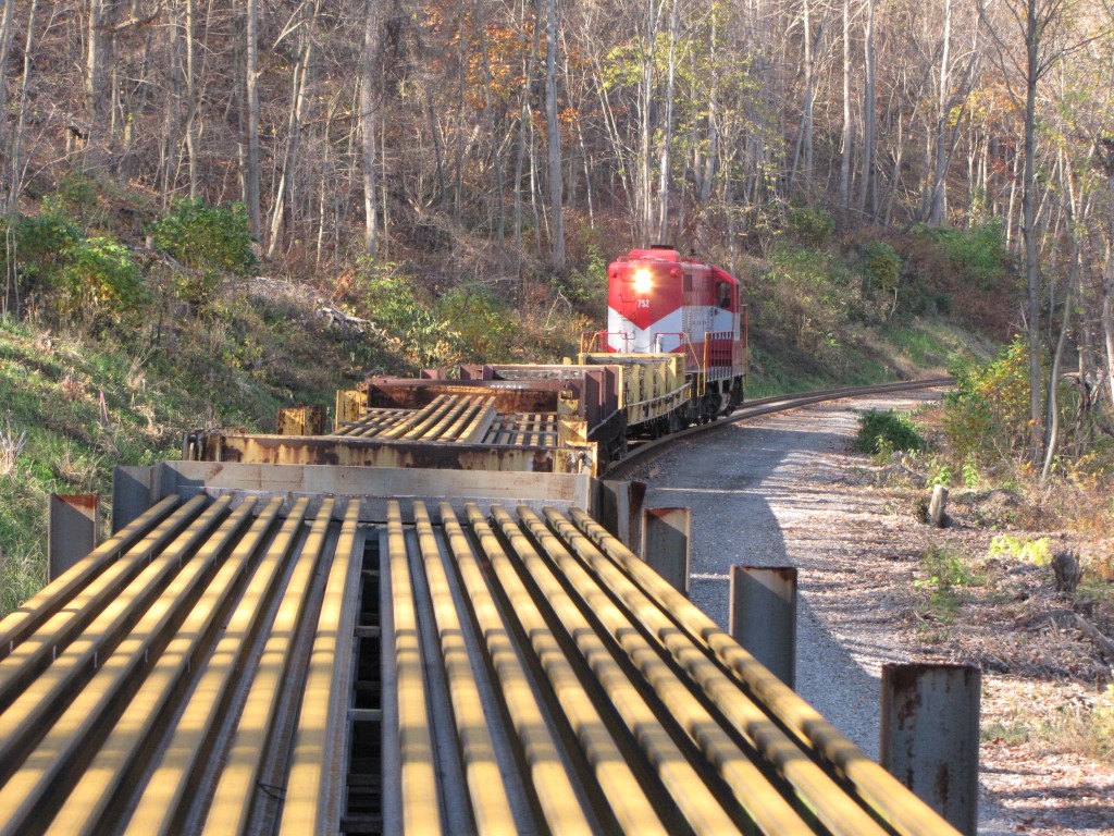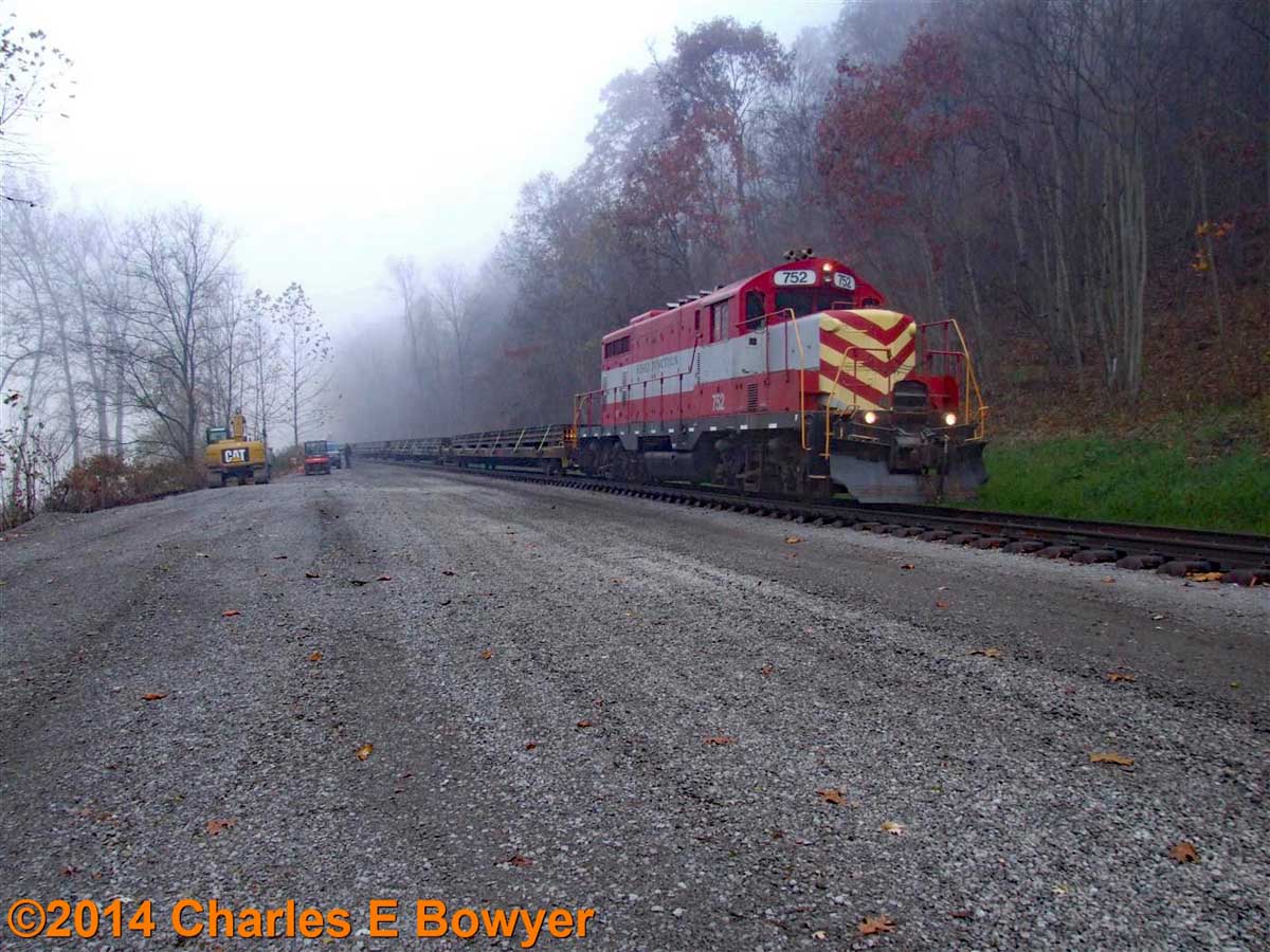 11/1/2010 at Kelly's Station, 5 miles north of Schenley, Pa. KJR 752 is delivering 80 foot lengths of new 115 pound rail to continue the line toward the coal mine at Logansport, Pa. After completion and 130 trains the mine became a victim of the war on coal and was closed. Abandonment proceedings have been filed with the Surface Transportation Board.     Charlie