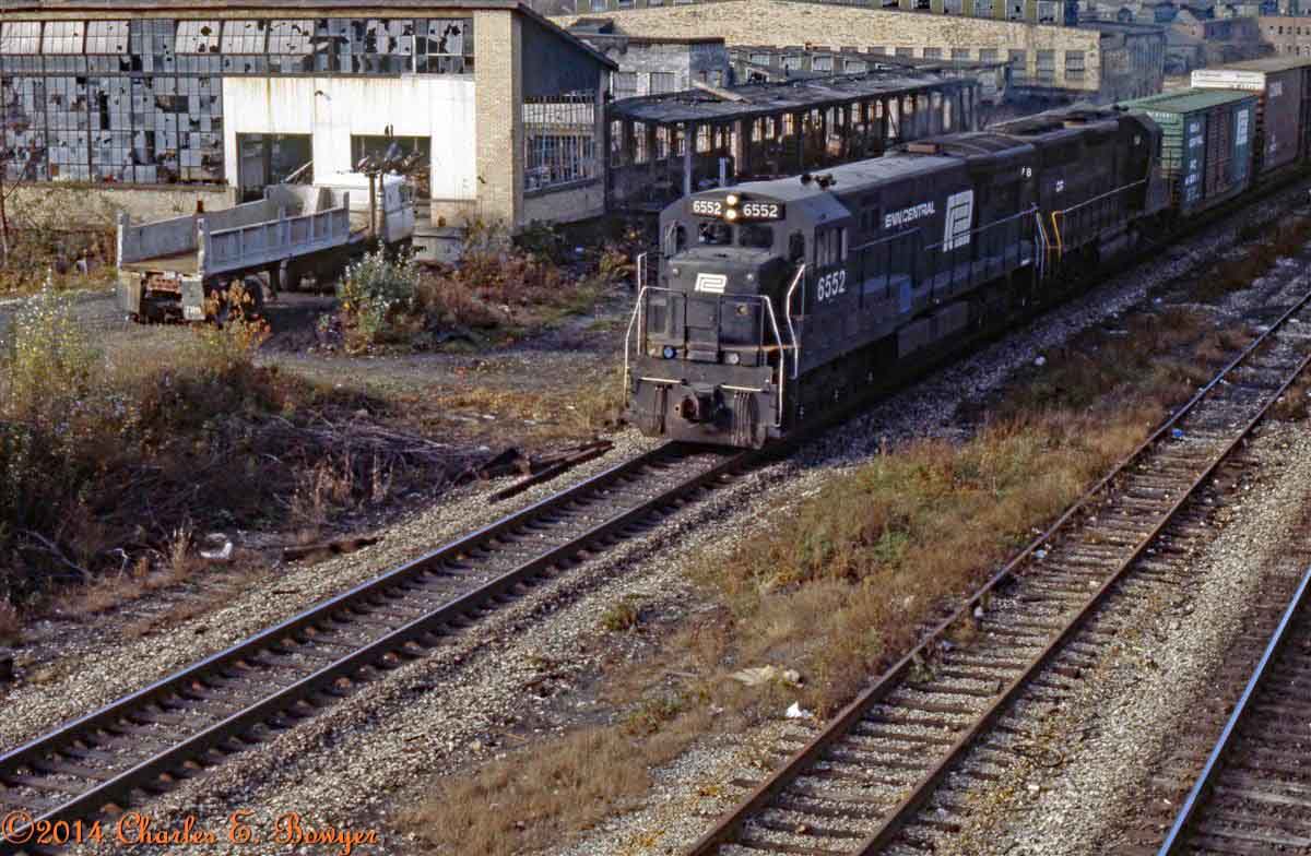 Eastbound past the remains of the W. S. George Pottery in East Palestine, Ohio. 11/5/1977.     Charlie