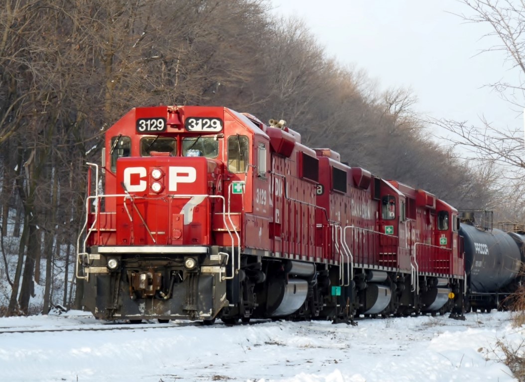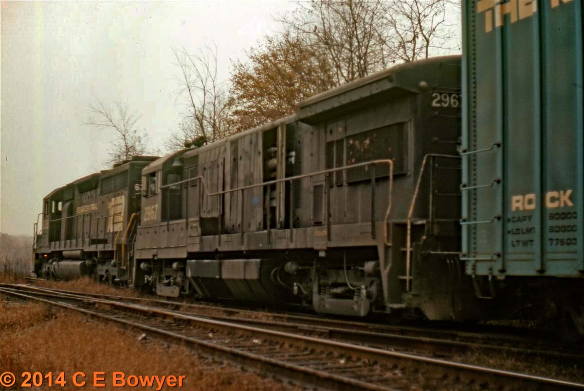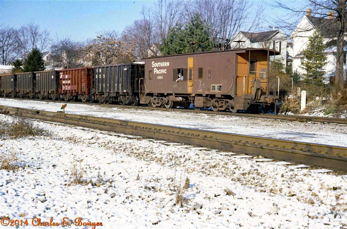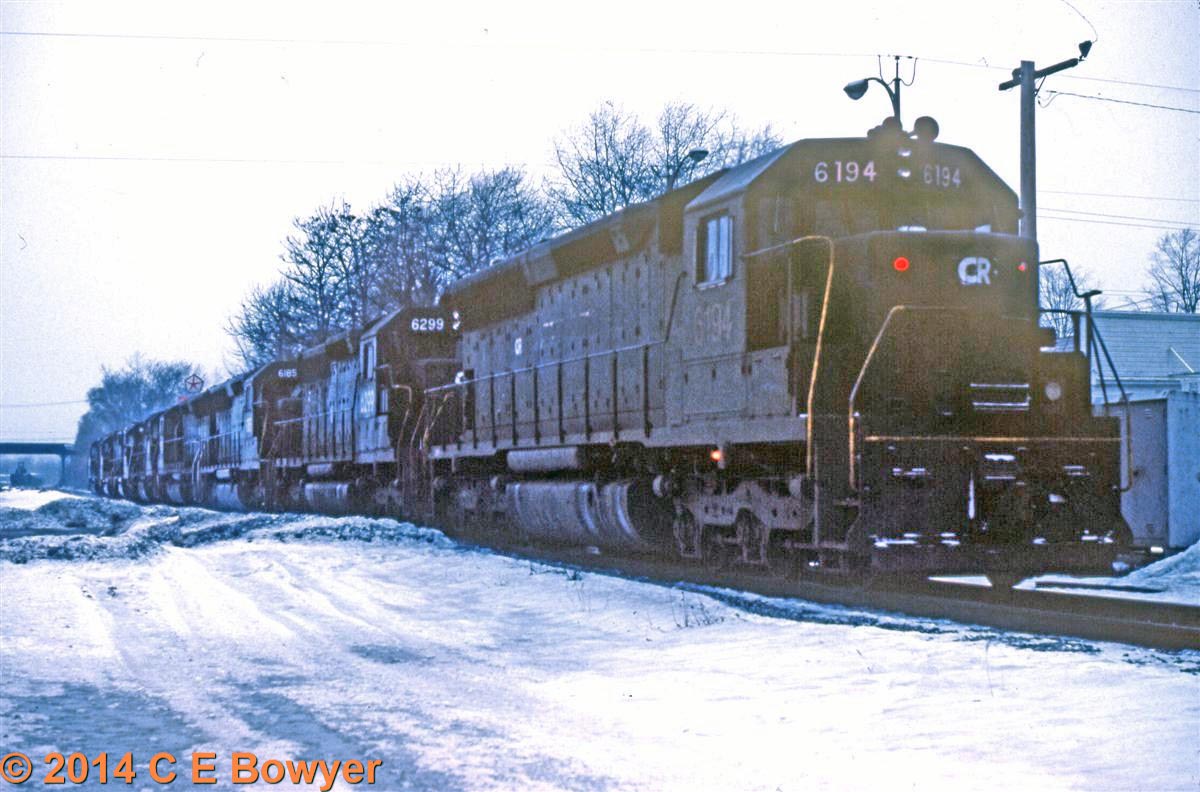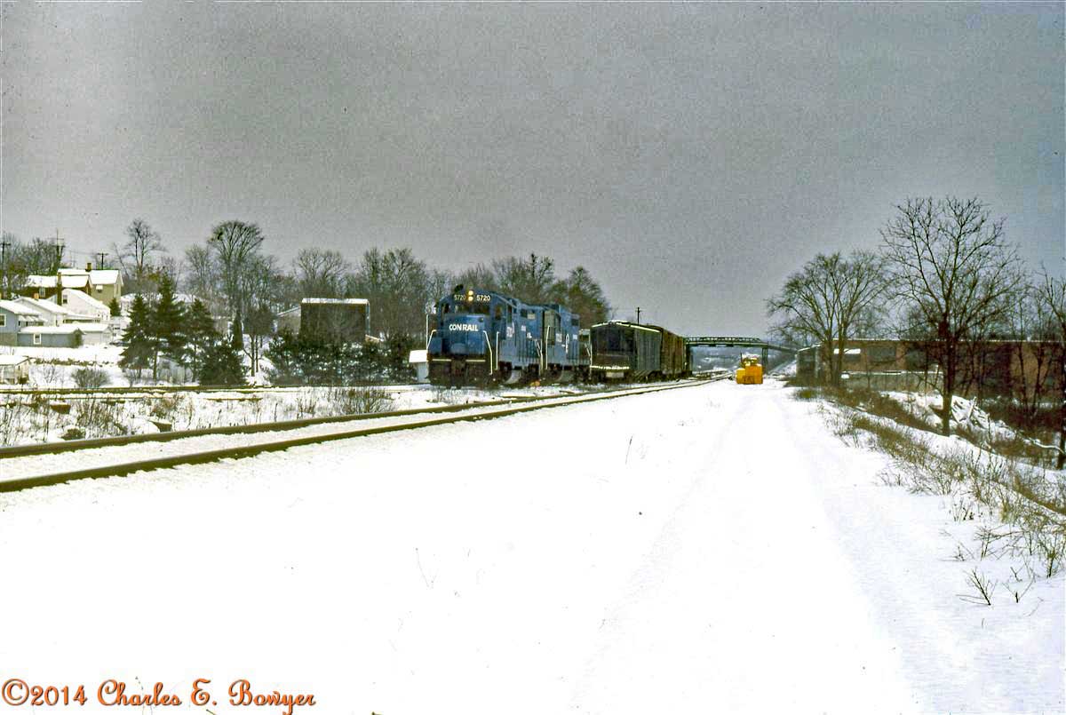 This SD45 is the rear unit in a power balancing consist westbound through East Palestine early in the brutal winter of 1977-78.
