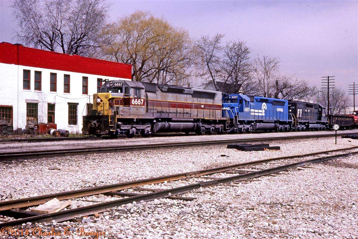 Westbound at East Palestine, Ohio. April, 1977.     Charlie