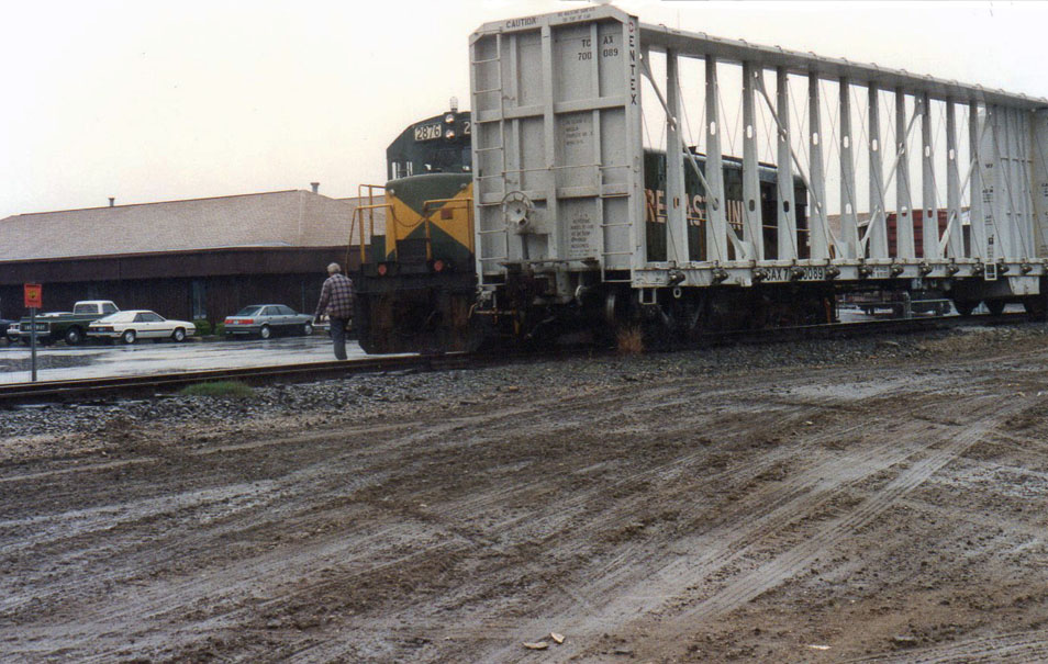 Shore Fast Lines GE U30B working Peter Lumber in Pleasantville, NJ, April 1991.