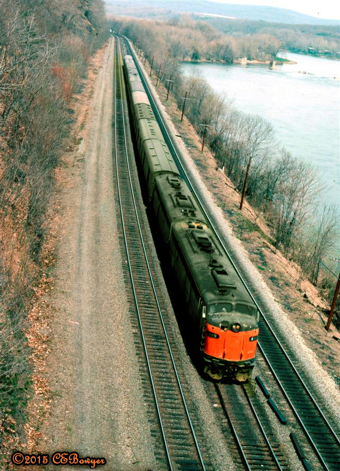 April 18, 1978, Amtrak's National Limited, train #30 from the PA RTE 15 bridge over Juniata River. The third track has been removed.