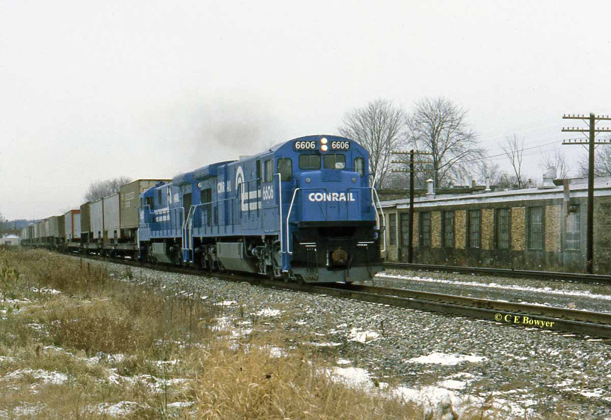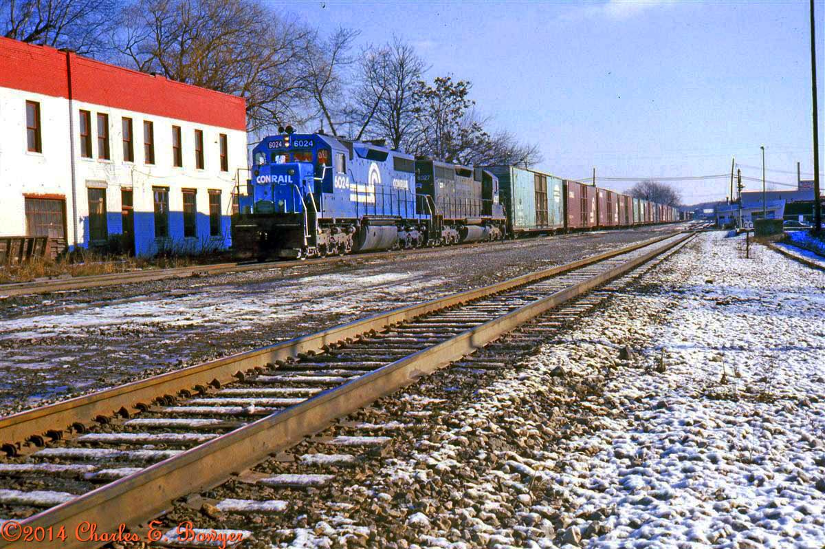 Conrail C30-7 6606 leads TV62 through East Palestine, Ohio on December 4, 1977. The unit was new in November.