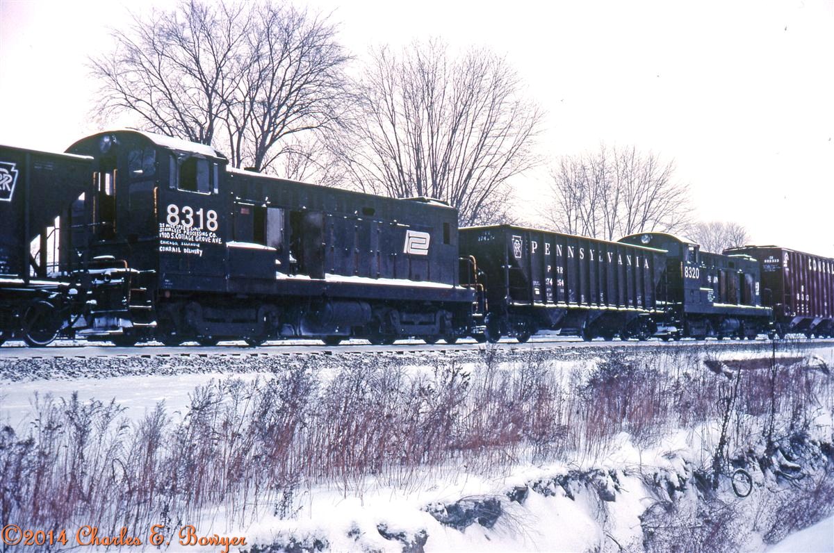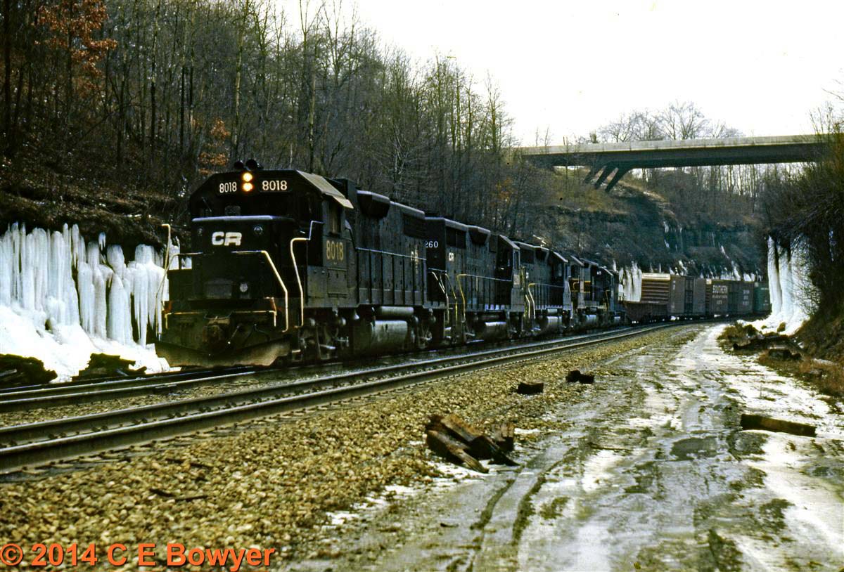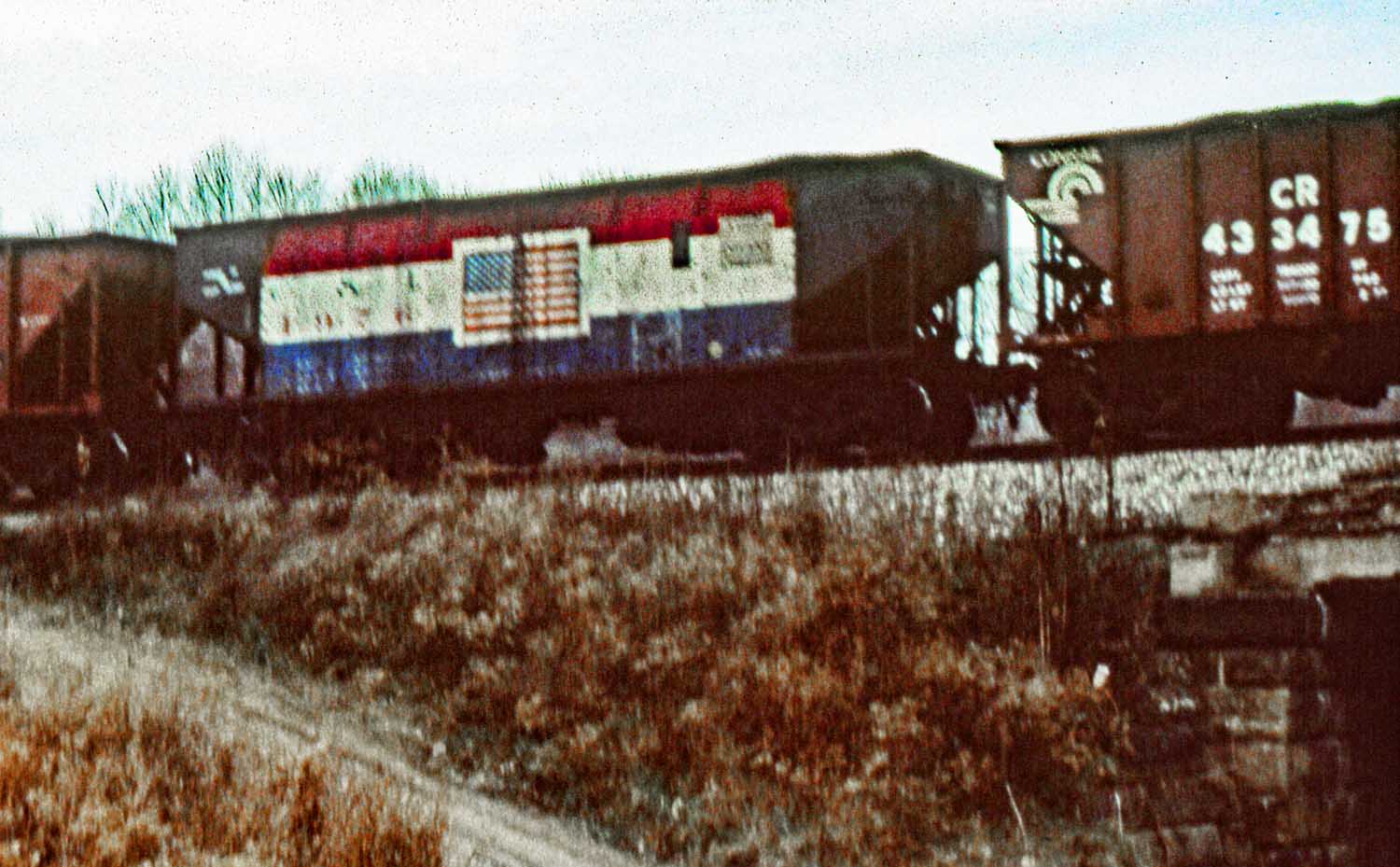 I am posting this really lousy photo of the Cambria and Indiana Bi-Centennial hopper car from January of 1978 to prove it was still running and had been interchanged with Conrail at that time. It is on a westbound loaded coal train going over Adams Road just west of East Palestine, Ohio.