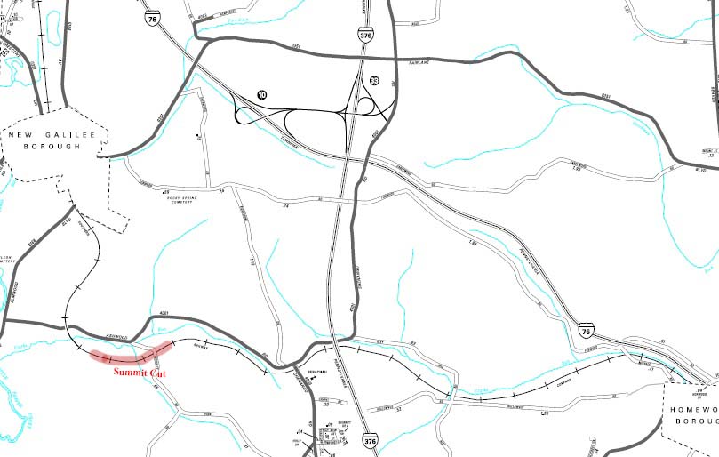 Here is a small map to give folks some idea where this cut is located. It is MP 37 and to the west by rail at MP 40 is New Galilee, Pa and to the east at MP 20 is Conway Yards, 20 miles west of Pittsburgh.  The mile marker count starts at the station in Pittsburgh. My home until I retired was next to the tracks on the northside at MP 50.1