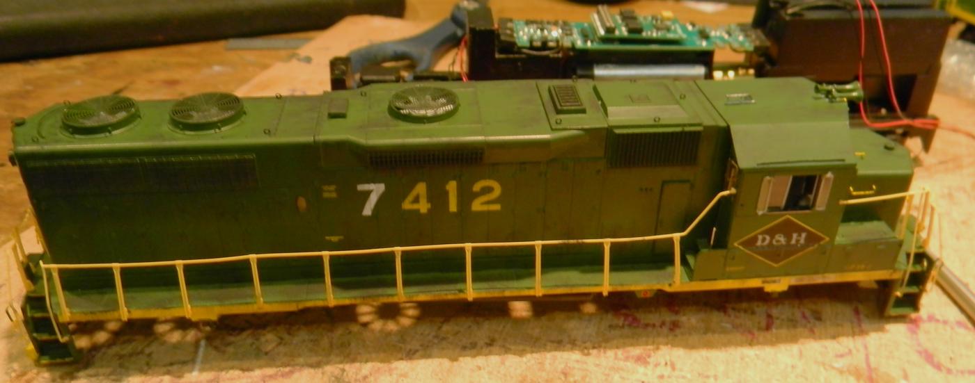 I was going to put her all back together (I had to remove the shell to get access to the motherboard) and run her with my D&H consist when something in my brain said.... "Wouldn't this be a good opportunity to weather this locomotive? (and actually start weathering the D&H fleet)". As opposed to most of my locomotives, dear old 7412 still was looking really good into 1978 - being one of the last purchases of the Reading company before inclusion in Conrail. Here's a shot from a slide up for sale on evil bay...