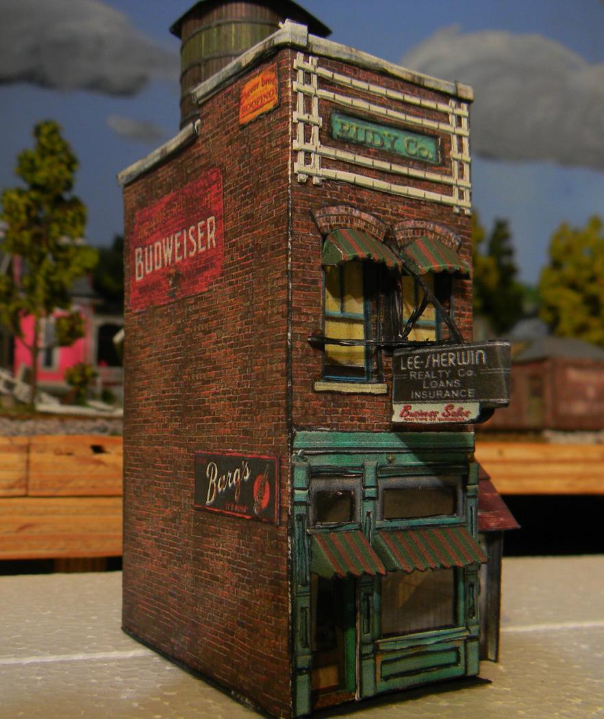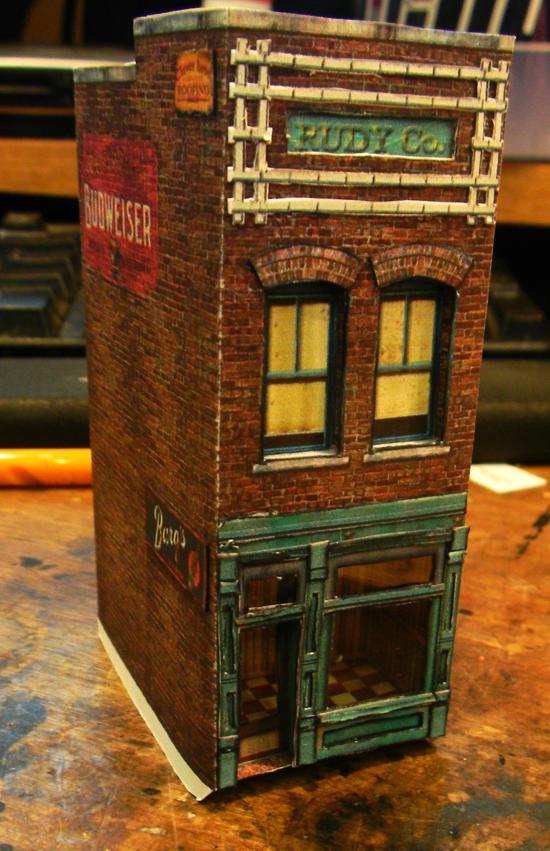 Well, the Rudy Co. building became a realtor's office with an apartment on the 2nd floor. The detail parts (especially the awnings, walkup and sign) took some time and patience, but the extra efforts were worth it. Really cool building that will look great on Main Street. The building still needs some paint touchups, but that can wait.