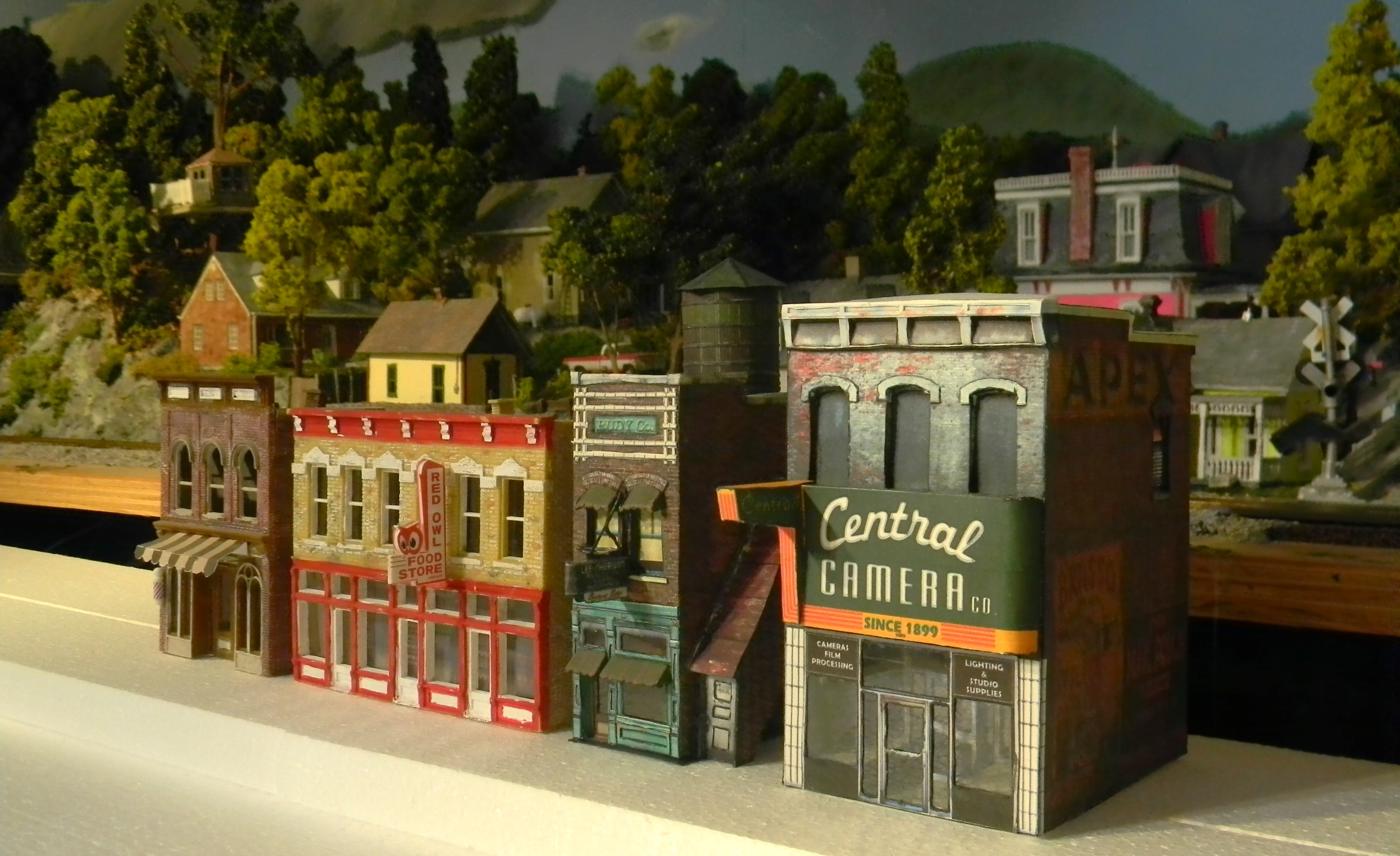 Here are the buildings for Main Street so far - the two on the left are plastic builds - I think they're both Walthers Cornerstone units, and the ones on the right are the recent Clever builds.