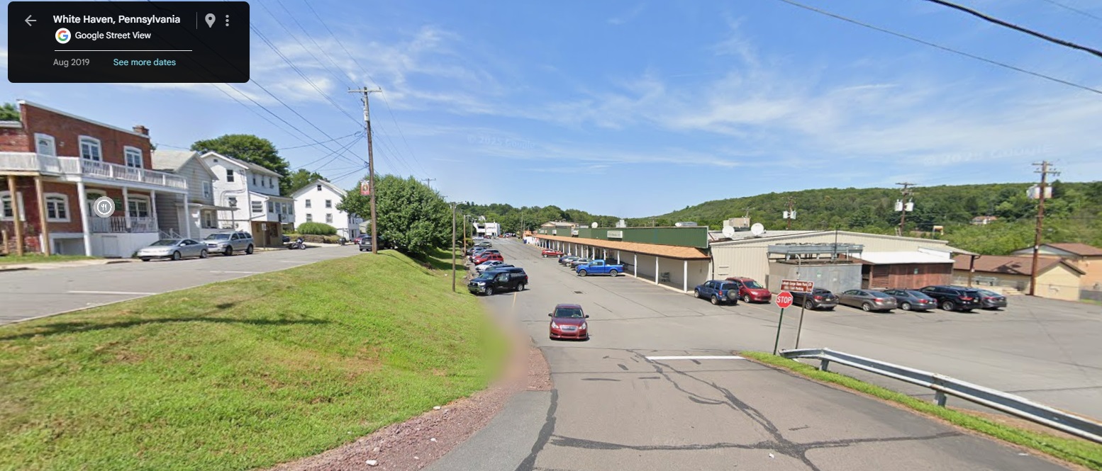 Main Street in the photo is actually the road above the strip mall, and it was my original intent to model the whole strip mall. However, I reread the article I found on what is the current White Haven Market. Turns out, the current market still occupies the same space as the ACME built in 1970, however, the Rite Aid pharmacy and Laudromat (among others) were more recent additions, and the front of the ACME was on the north face of the original building (the current front doors of the market are on the west side of the building under the green facade). I'll try to keep your head from spinning with another photo - this time an aerial: