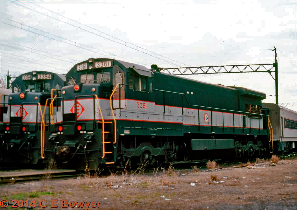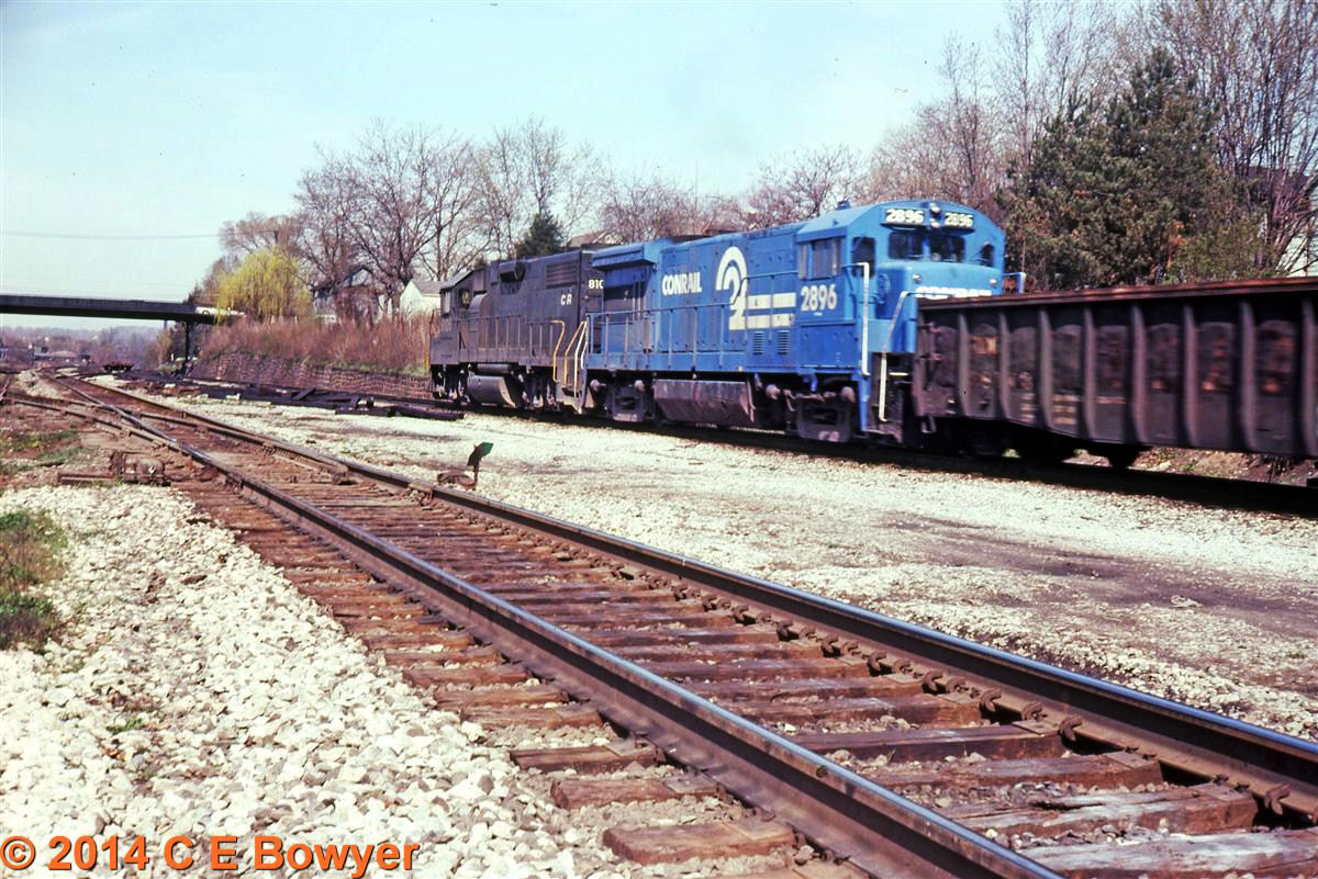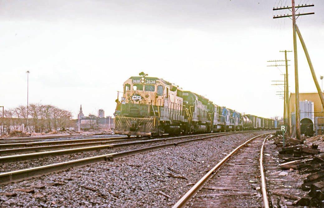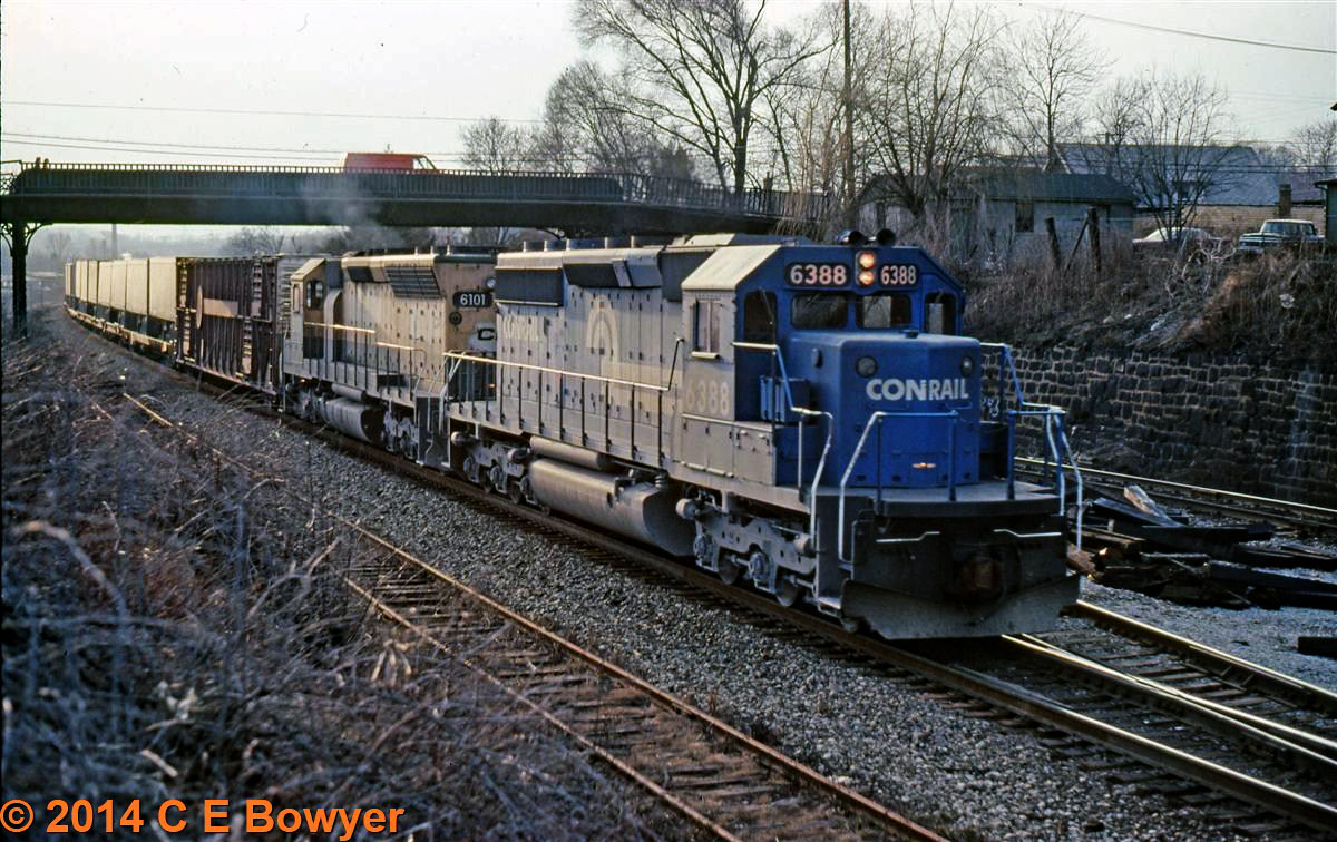 4/16/1978. Dover, New Jersey. This U34CH is now numbered in the Conrail numbers but is a commuter locomotive based at Dover. I am a GE fan and I am one of the few that liked running them. I ran a B30-9 a couple days switching on the NCIR and I really liked the ride and the way it handled.
