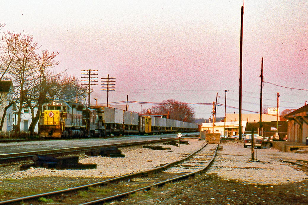 April, 1978. This westbound manifest is about to pass under West Street in East Palestine, Ohio.      Charlie