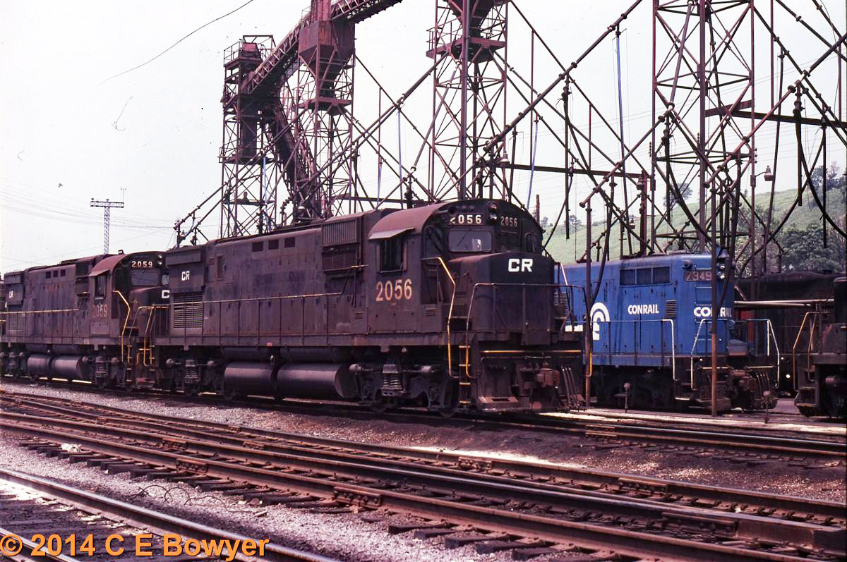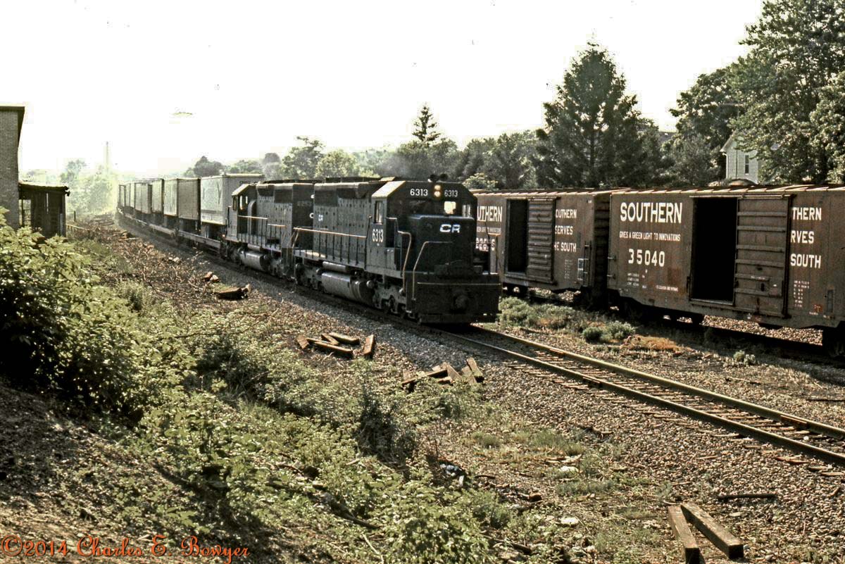 Conrail SD40 leads this eastbound at MP 50.1. East Palestine, Ohio. The ruins of the W S George pottery are to the left.