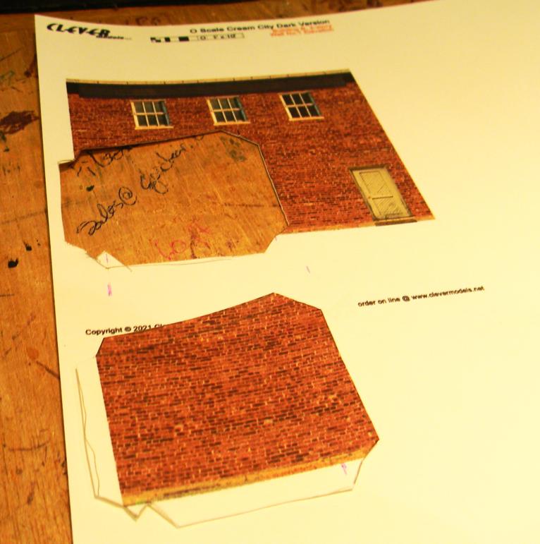 and then decided to attack the cardstock portions of the front face first - the brick sections nearest the front corners including doors as the first priority. I found a 2-story section of brick from the Cream City kit to use as the brick for those sections of the building and used solid doors from that same kit. Since the shopper doors are transparent, I'll use the ones I just built from the Central Camera kit. I also need to remember that my front face will be a mirror image of the prototype - the shopper doors will be on the right corner, the solid doors on the other side. I'll be working on these brick sections and adding the doors which will take some time.