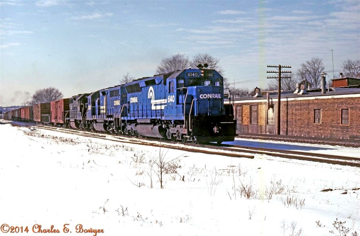 An eastbound manifest train with SD45 6140 in the lead heading for Conway on this clear December day in 1979