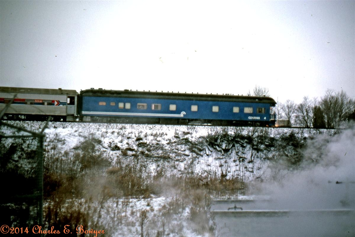 Amtrak train 41 had  Conrail business car 4 on the rear and here the train sits at Smith crossover in East Palestine waiting for number 1 track to clear so it can crossover and proceed west. It is already 7 hours late. December 7, 1977