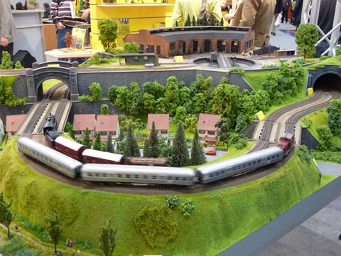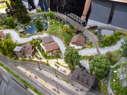 Last for Noch are some layout pictures. They sell several different styles of injection-molded shells that form the structure of a small layout. I didn't measure, but I'd guess they were 1m x 2m. These seem to be very popular in Europe, which makes sense given the smaller spaces. The shells come bare, very lightly scenicked (a thin ground foam), or if you want, they will completely scenic the layout, lay the track (your choice of European Smile vendor) and wire it. My friend has sold one of the latter and reports back that it was VERY nicely done.