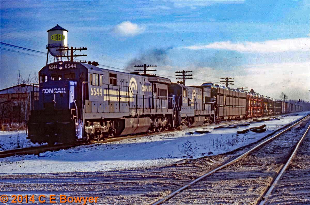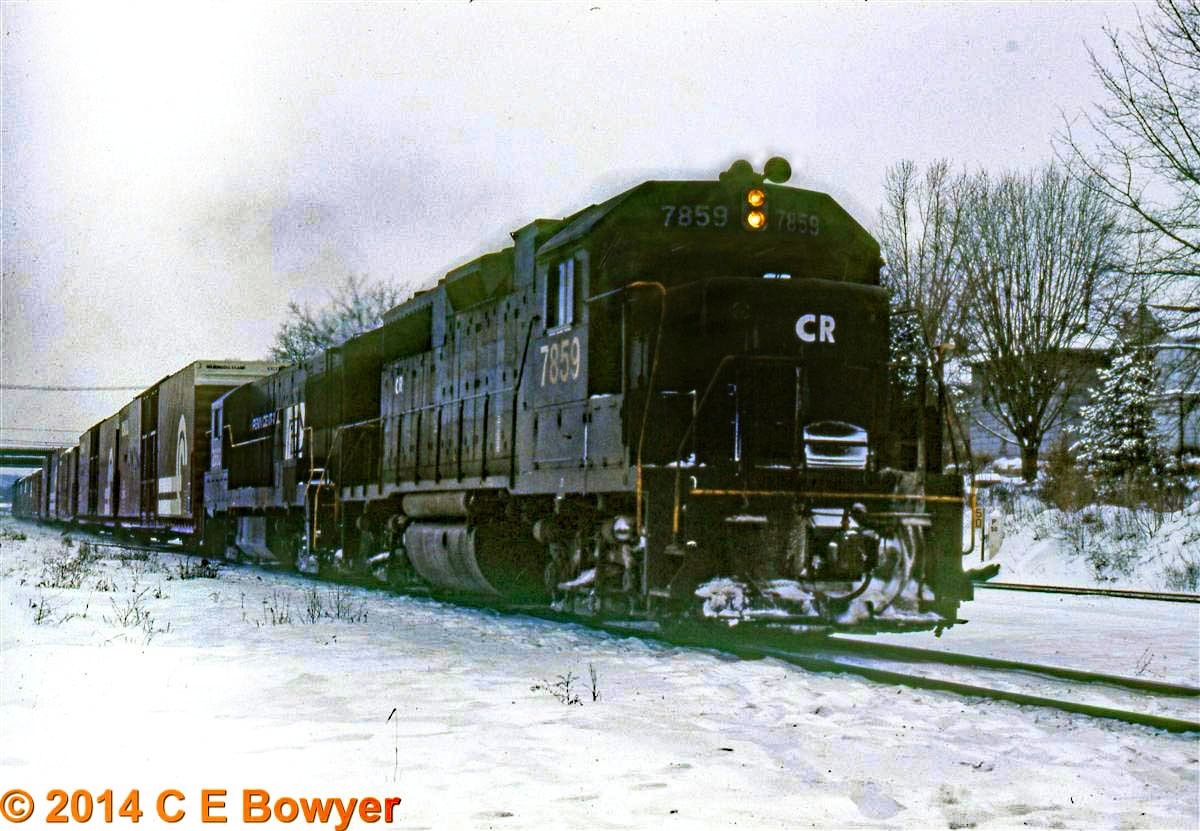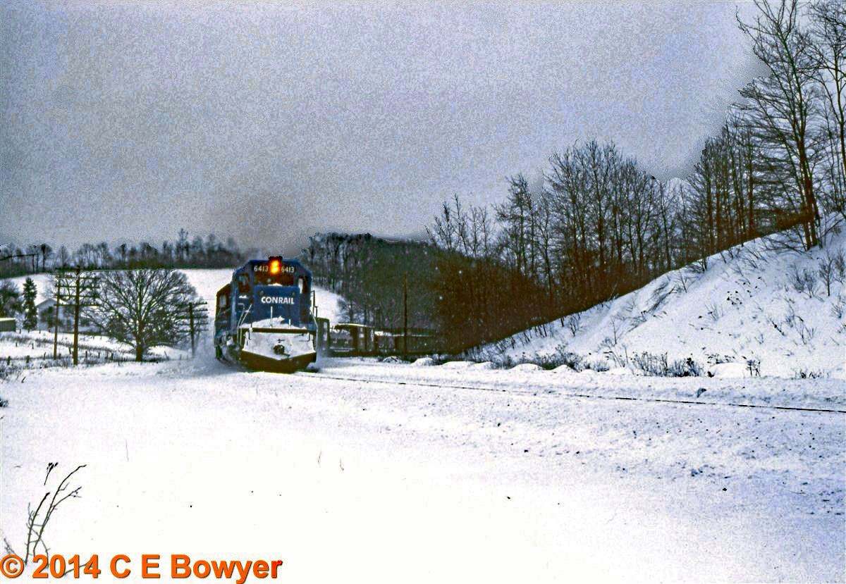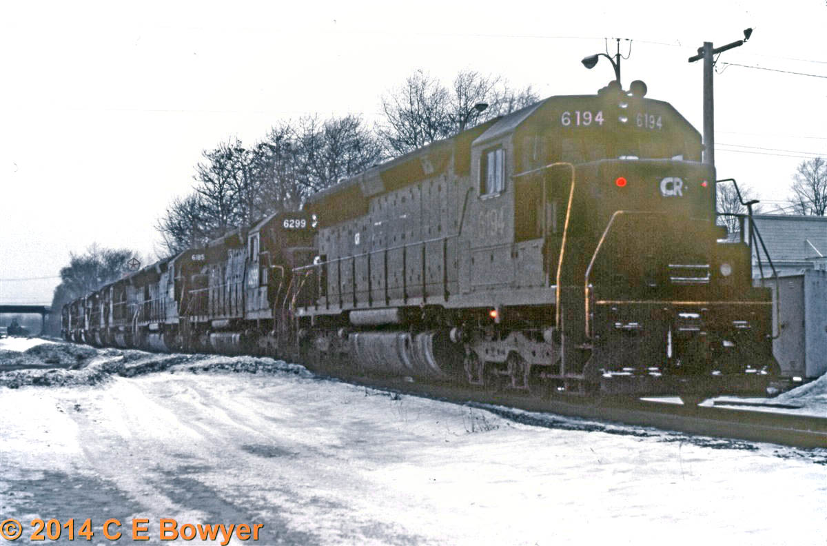 Jan., 15, 1978 North Pleasant Drive, East Palestine. Westbound with a consist of GE locomotives. A U33C leads aq U23B.  And it was COLD.