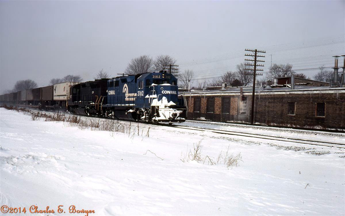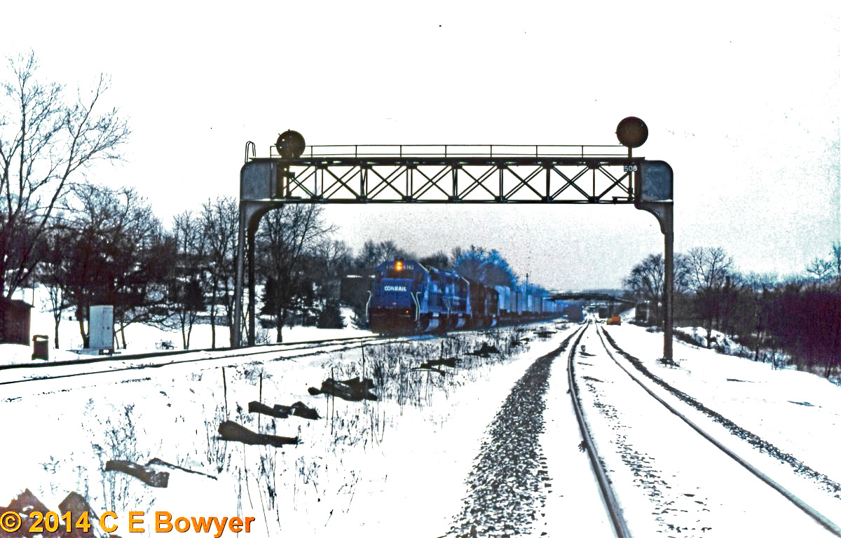 Westbound at the signal at MP 50.8 (Buckeye) on the west side of East Palestine, Ohio. 1/28/1978     Charlie