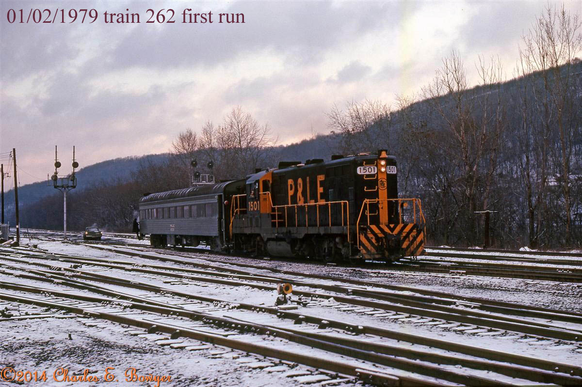 January 2, 1979. P&LE began running a second train into Pittsburgh. Here it is preparing to leave College Station at Beaver Falls. My good friend Joe Jack and I rode this train into Pittsburgh.