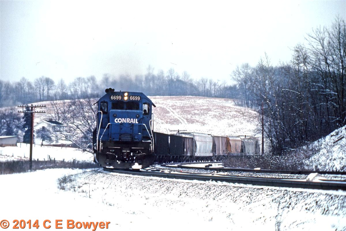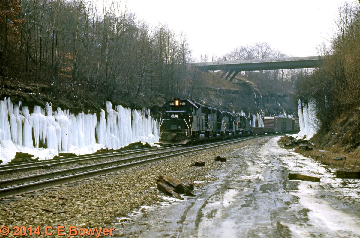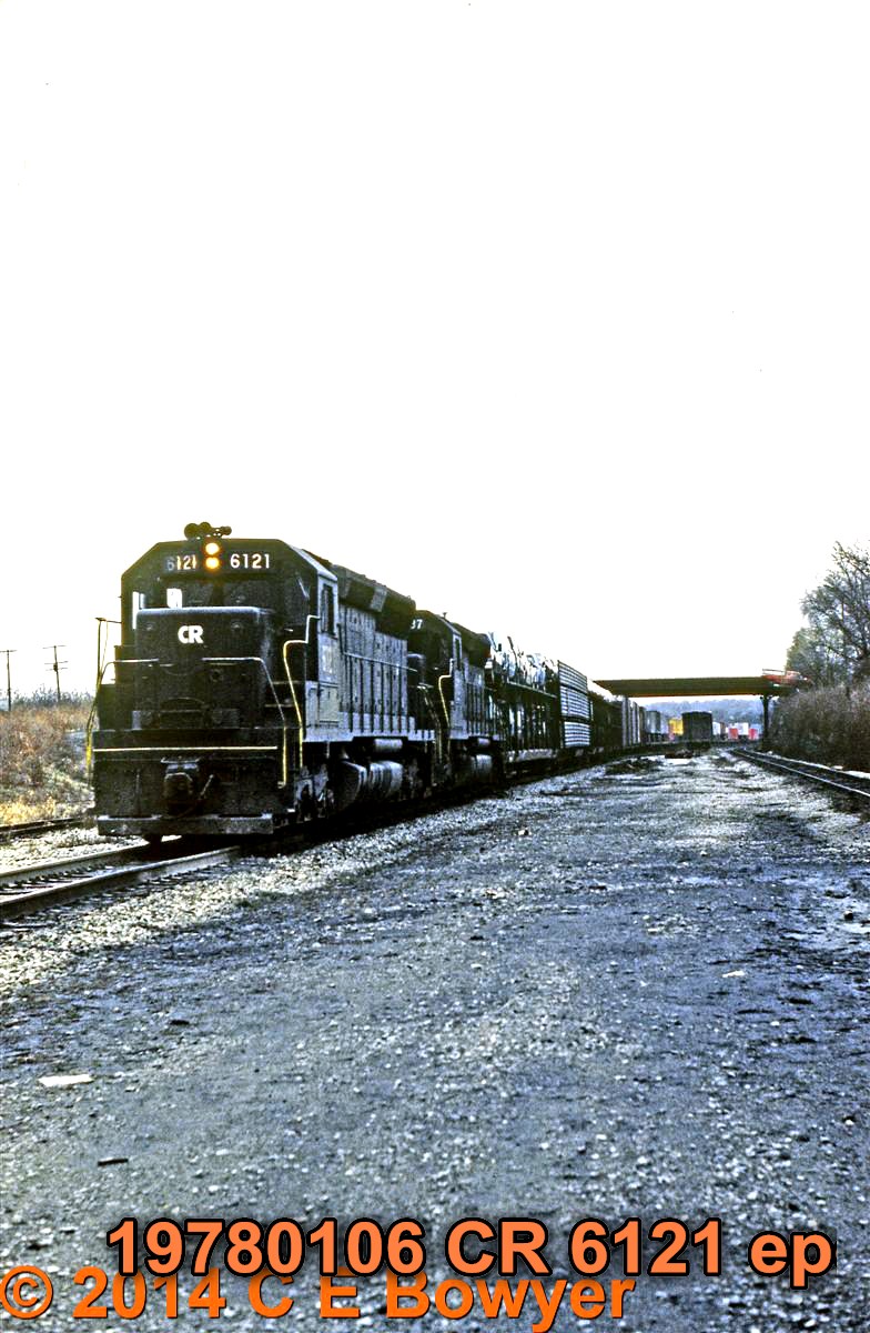January 6, 1978. East bound headed with an SD45 waiting a recrew at East Palestine, Ohio