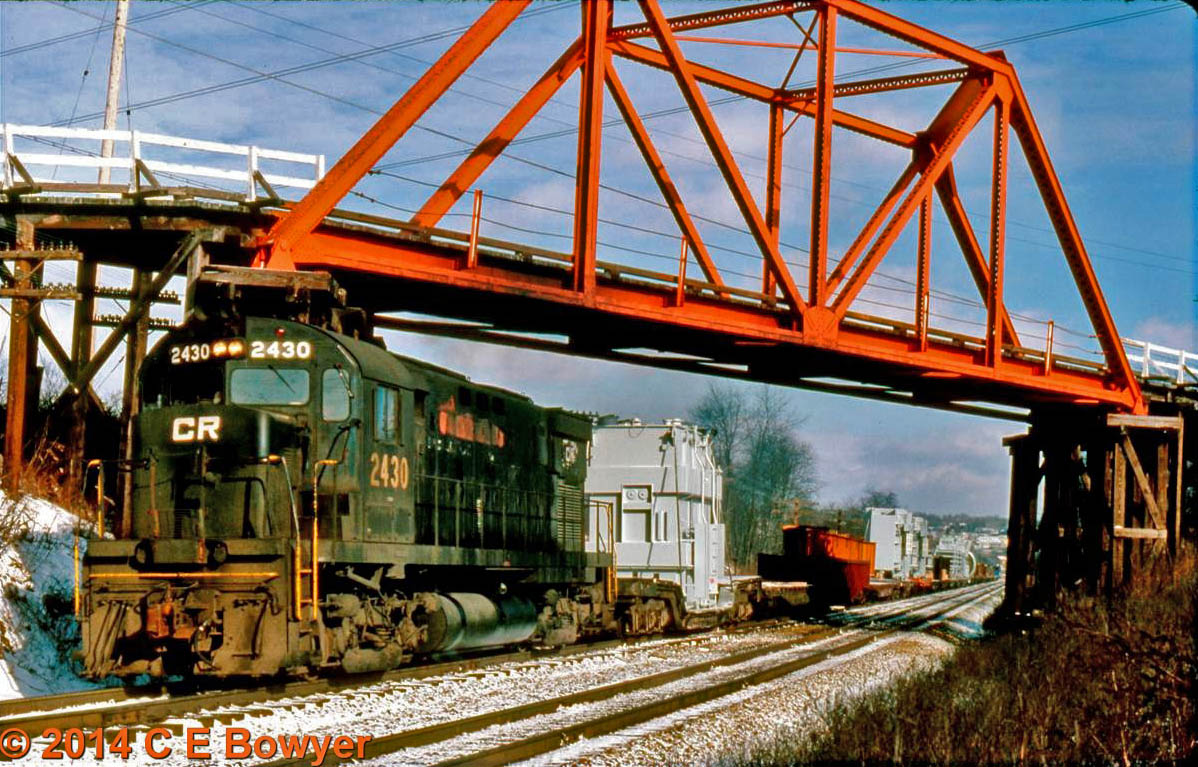 A clear day on January 7 1978. An Alco C425, Ex PRR under the old Neeld Road Bridge with a high and wide train westbound.     Charlie
