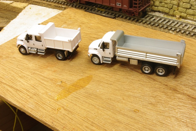 On vehicles, here are two Boley white dump trucks I recently got from 3000toys:     I think either one of these could credibly get railroad logos, and probably wouldn't need to be converted to hi-rail, either. I'll probably paint the dump body on the larger truck white.