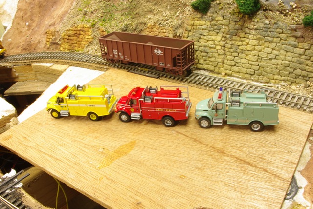 Here's another interesting item, some Boley brush pumpers that I've gotten over a period of time:     The yellow one is for the US Bureau of Land Management, the red one would be a local community fire department, and the green one is for the US Forest Service. Boley did others in other schemes. I wouldn't use these for an urban scene, as most of Boley's fire apparatus is for western brush or forest fire type activity. But here are some similar units I caught last year staging for a brush fire near Tehachapi:     Note the prototype units have crew cabs, but the models don't.
